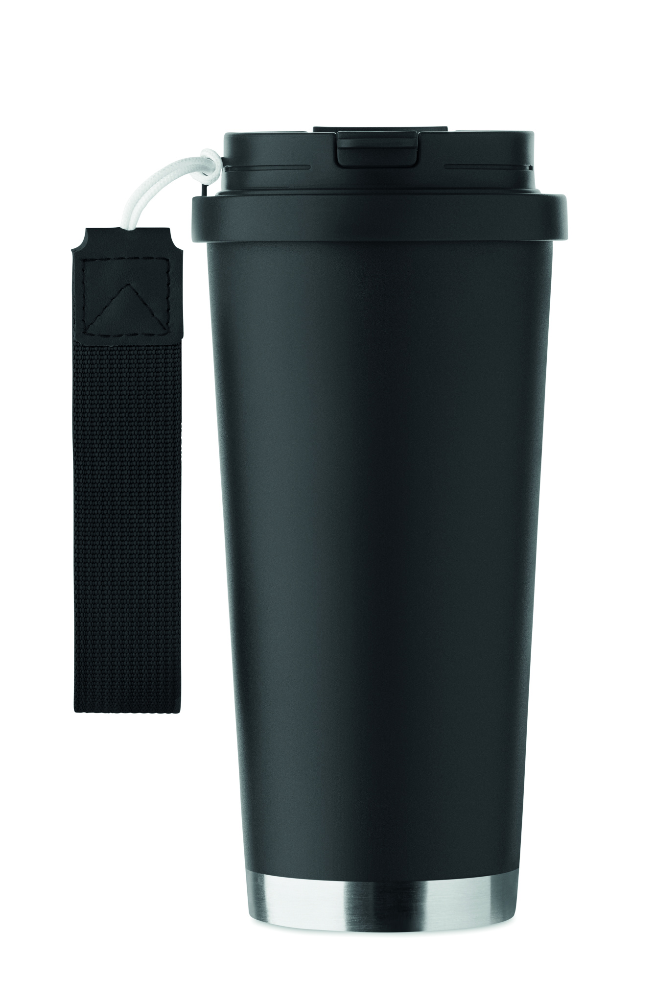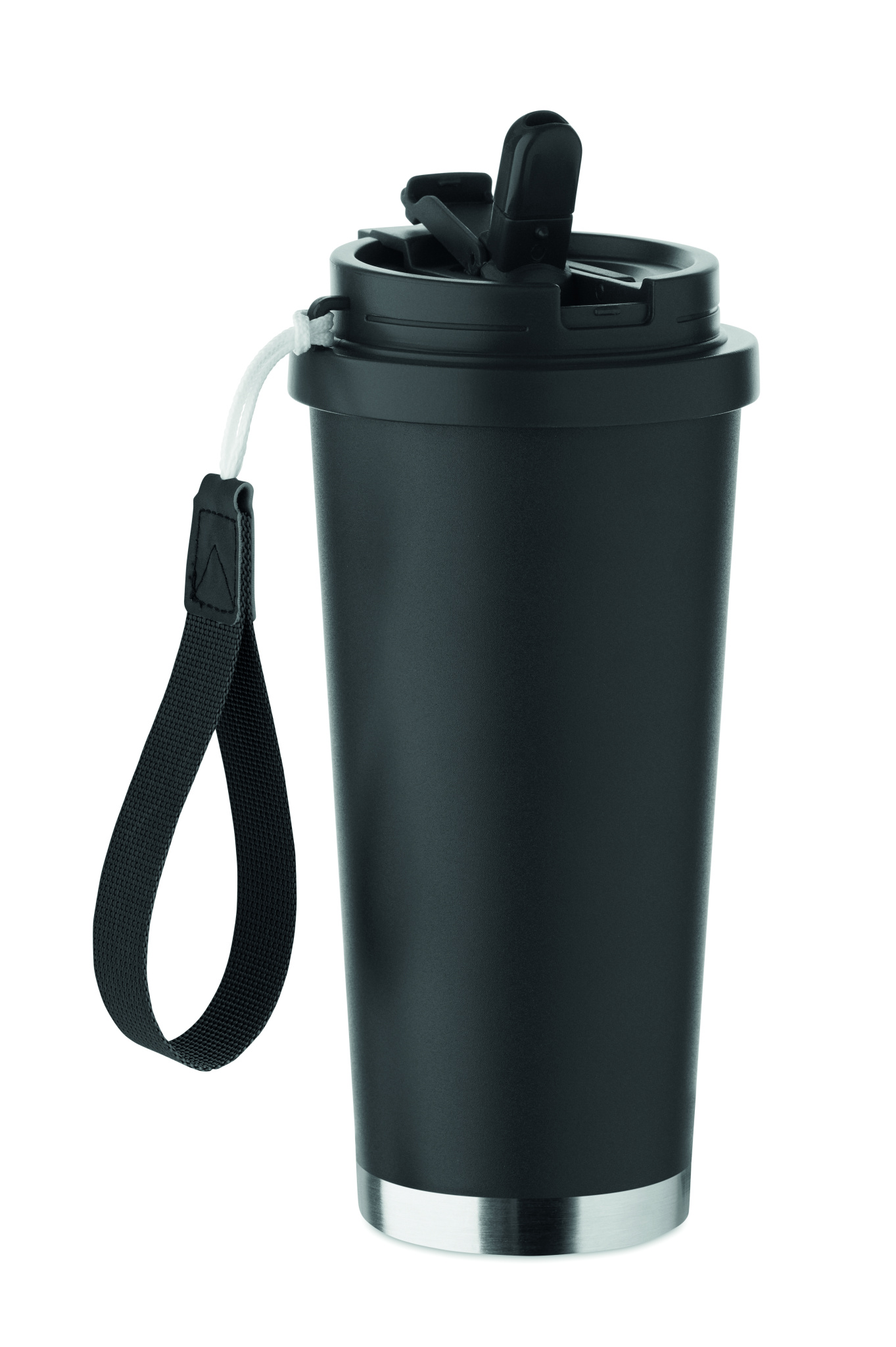 Double wall 90% recycled stainless steel (90% recycled stainless and 10% stainless steel) tumbler with PP lid (2-in-1 drinking sip and straw lid) and with RPET carry strap. Leak-free. Capacity: 500 ml.