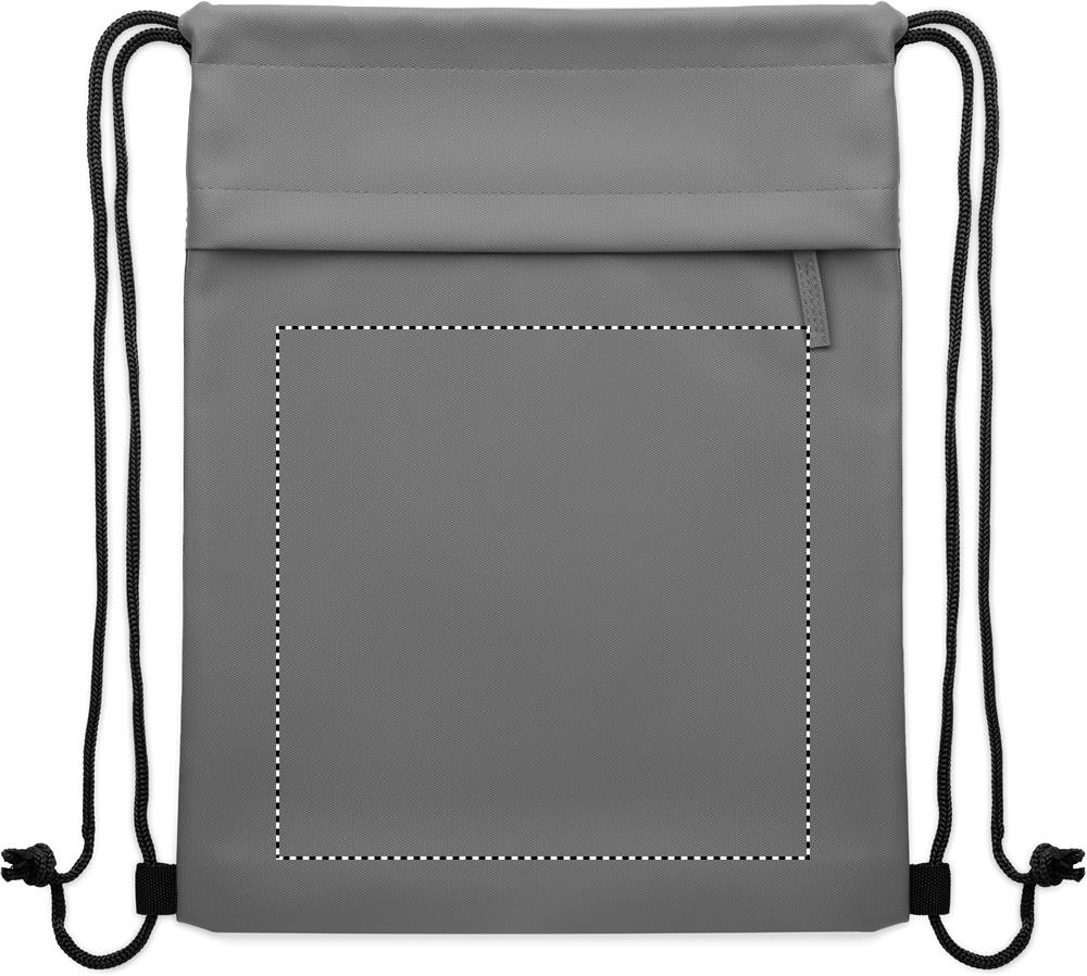 Drawstring bag with PU coated 600D RPET polyester and 190T RPET polyester lining. Zippered front pocket.