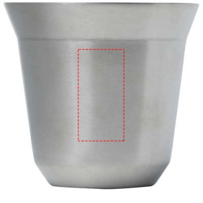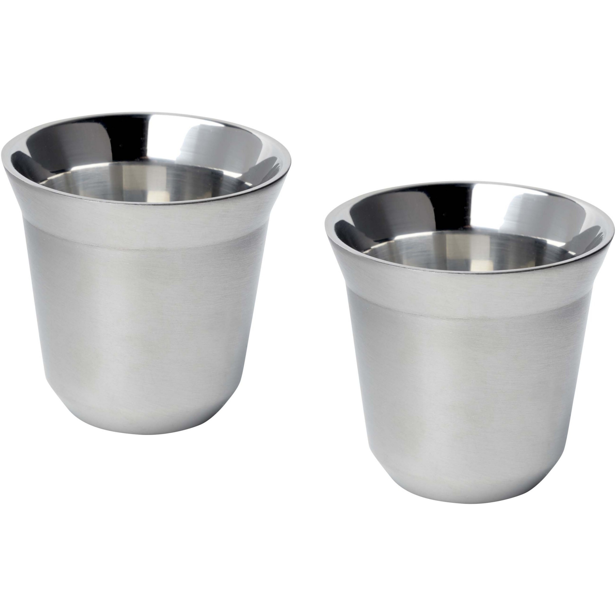 Набор из 2 чашек для эспрессо из нержавеющей стали, сертифицированной RCS, с двойными стенками. Объем — 80 мл. Поставляется в подарочной коробке из переработанного картона.