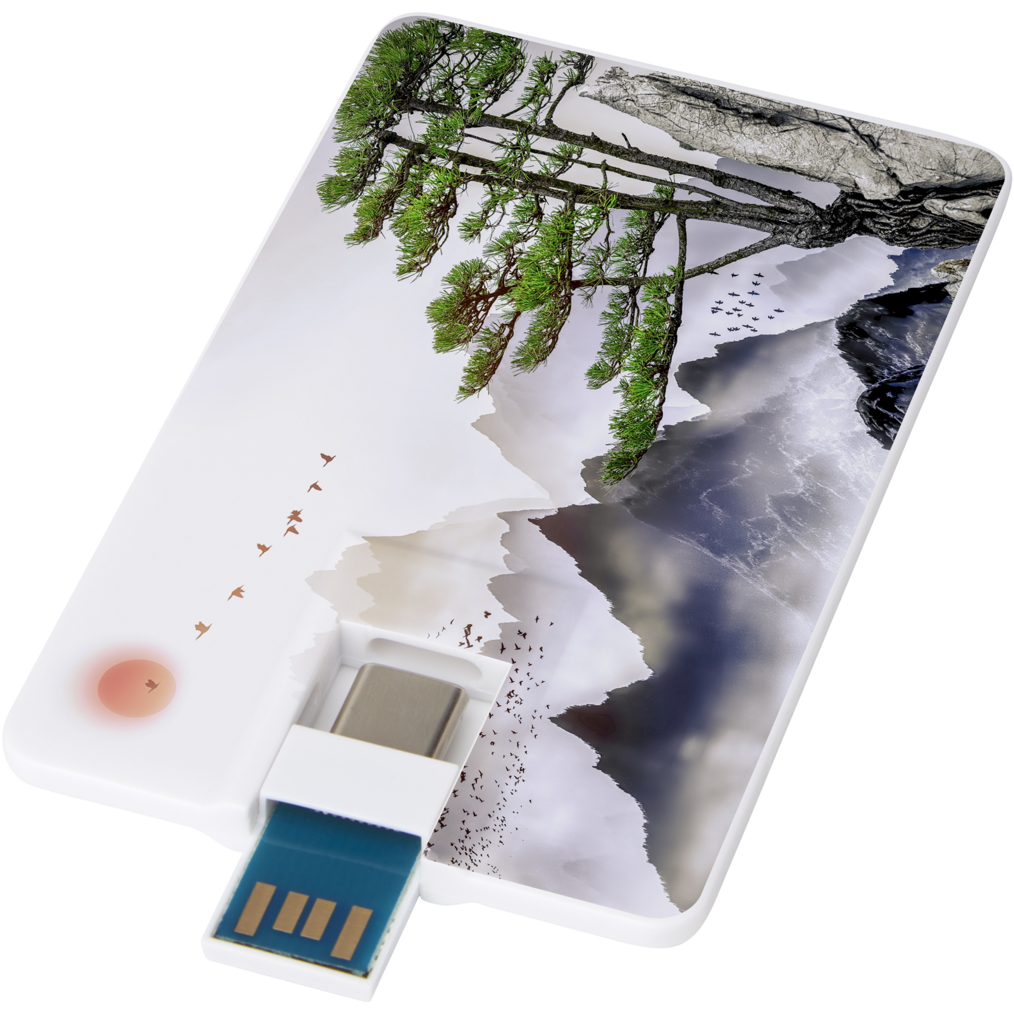 Вращающийся USB-накопитель следующего поколения емкостью 32 ГБ, оборудованный двумя разъемами (Type-C и USB-A). USB 3.0 со скоростью записи 9 МБ/с и скоростью чтения 20 МБ/с. Поставляется в конверте.