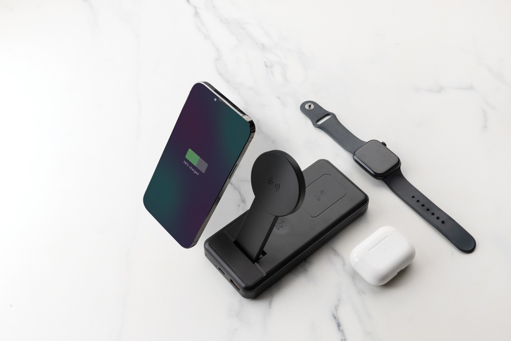 Уникальный дизайн 3 в 1, внешний аккумулятор емкостью 10 000 мАч и мощностью 15 Вт с корпусом из переработанного АБС-пластика, сертифицированного RCS. RCS (стандарт утверждения о переработке) — это стандарт для проверки содержания переработанных материалов в продукте по всей цепочке поставок. Общее содержание переработанных материалов: 22 % от общего веса товара. Внешний аккумулятор содержит долговечный литий-полимерный аккумулятор класса А емкостью 10 000 мАч. Внешний аккумулятор имеет складную встроенную магнитную беспроводную зарядную стойку мощностью 15 Вт и дополнительное беспроводное зарядное устройство мощностью 5 Вт, которое можно использовать для небольших беспроводных устройств, таких как чехлы для наушников, и третье зарядное устройство мощностью 2,5 Вт для часов IOS. Индикаторы питания покажут оставшийся уровень энергии, поэтому вы всегда будете знать, когда следует подзарядить.; товар и аксессуары не содержат ПВХ. В комплект входит сертифицированный RCS переработанный кабель для зарядки TPE. Упаковано в упаковку FSC® mix. Вход Type-C 5 В 2,5 А 9 В 2 А 12 В 1,5 А; Выход Type-C: 5 В 3 А 9 В 2,22 А 12 В 1,67 А; Выход USB-A: 5 В 3 А 9 В 2 А 12 В 1,5 А 5 В 4,5 А
