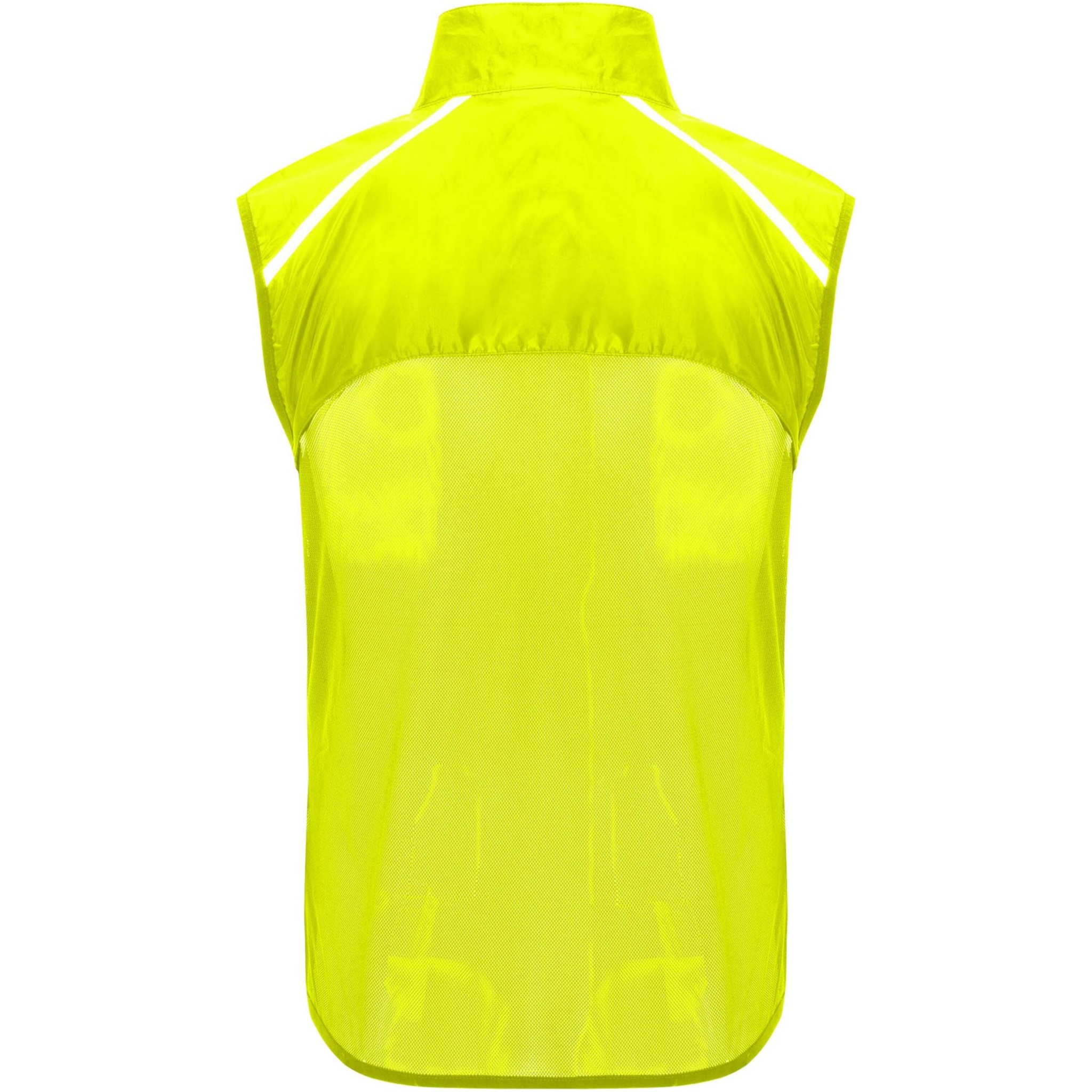 Ветрозащитный и дышащий. Передняя молния с защитой подбородка в тон. Эластичная окантовка в пройме и по низу. Нижняя часть спины из ткани с микроперфорацией. Яркие детали сверху, спереди и сзади. Карман с эластичным ремешком, позволяющий сложить жилет и носить его на запястье. Съемная этикетка.