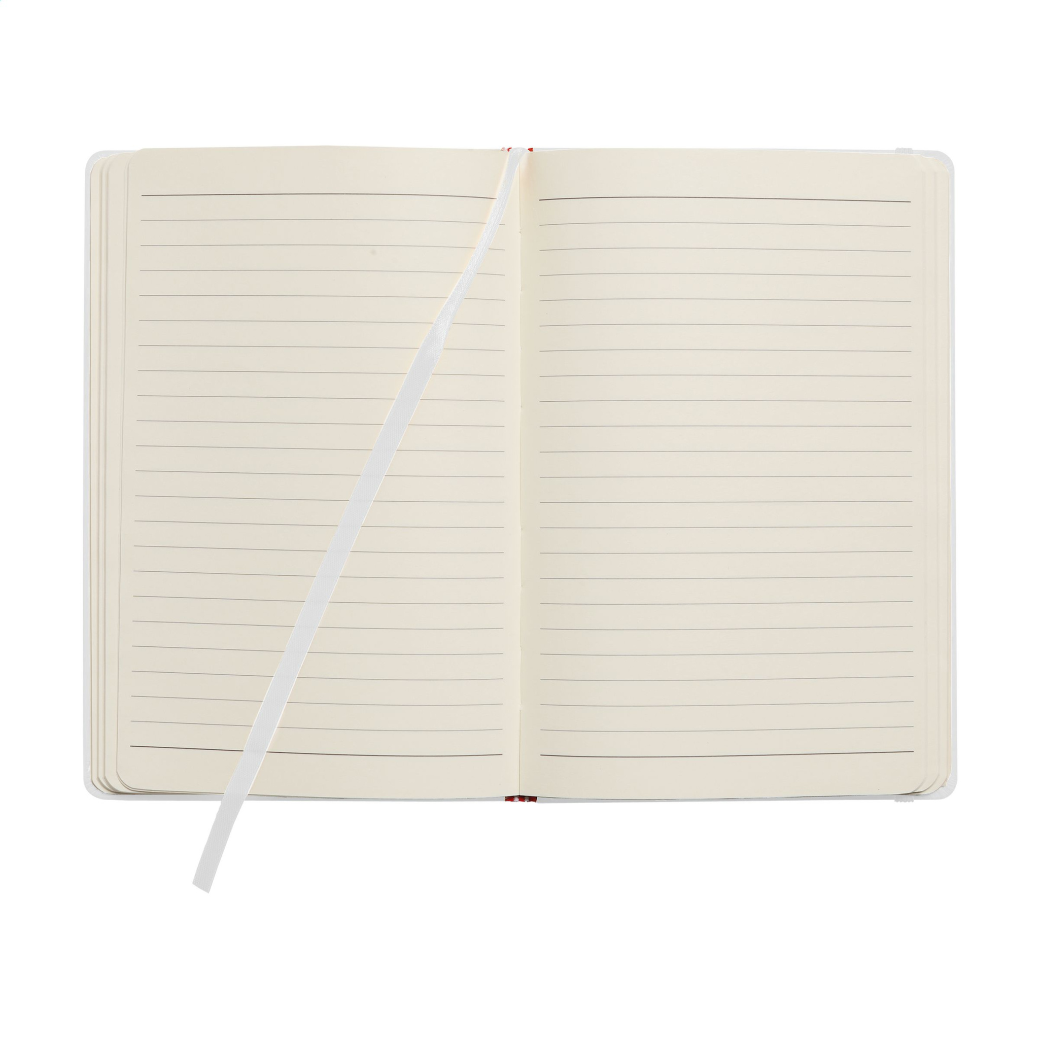 Тетрадь формата А5 с примерно 96 листами/192 страницами кремовой линованной бумаги (80 г/м²). С клеевым переплетом, твердой обложкой, карманом, эластичной застежкой и шелковой лентой.