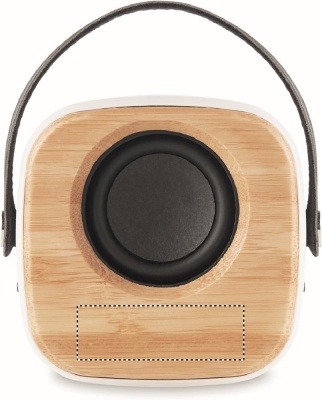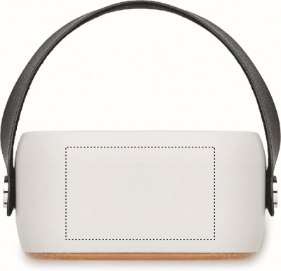 Колонка беспроводная из пластика ABS с отделкой из бамбука. Ремешок из ПУ. Встроенная 1 литий-ионная аккумуляторная батарея 500 мАч. Выходные данные: 3 Вт и 4 Ом. Время игры ок. 4 часов.