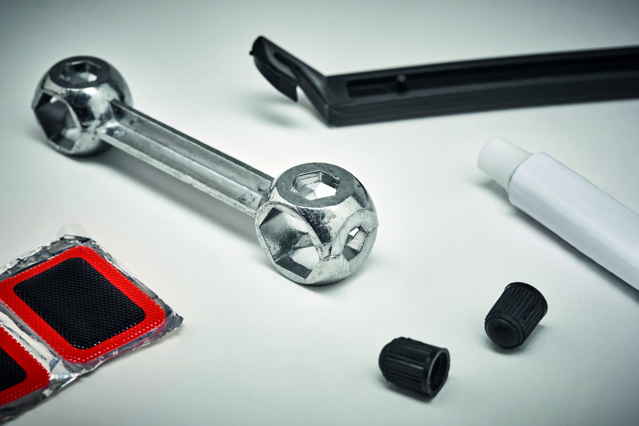 Ремонтный комплект для велосипеда. Содержит 1 ключ, 2 монтажки, 2 колпачка , 2 ниппеля, 1 клей, 1 терка, 5 ремонтных заплат. Размещено в прозрачной коробке.