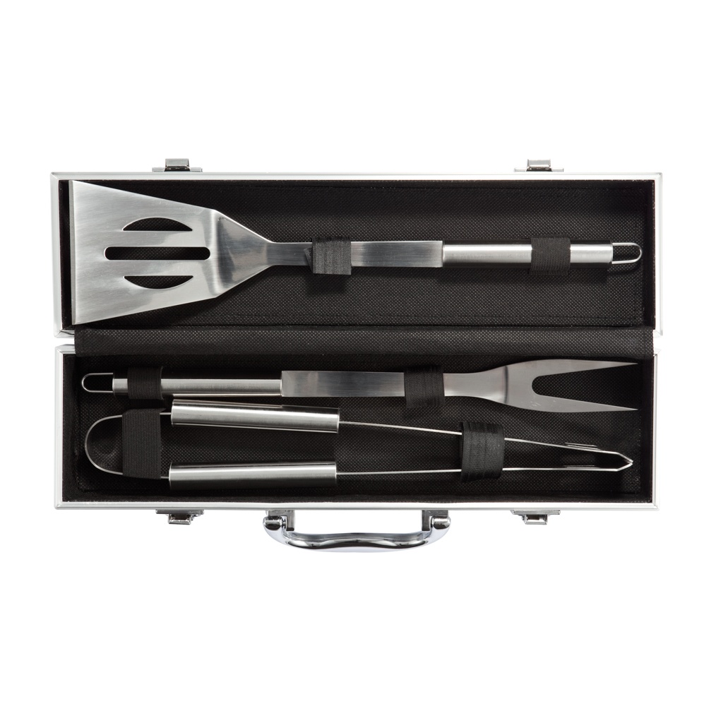 Набор для барбекю из 3 предметов из нержавеющей стали, включая лопатку, вилку для разделки с защитным чехлом и пару щипцов, ручки из нержавеющей стали. Упакован в алюминиевый кейс с ручкой и петлями.
