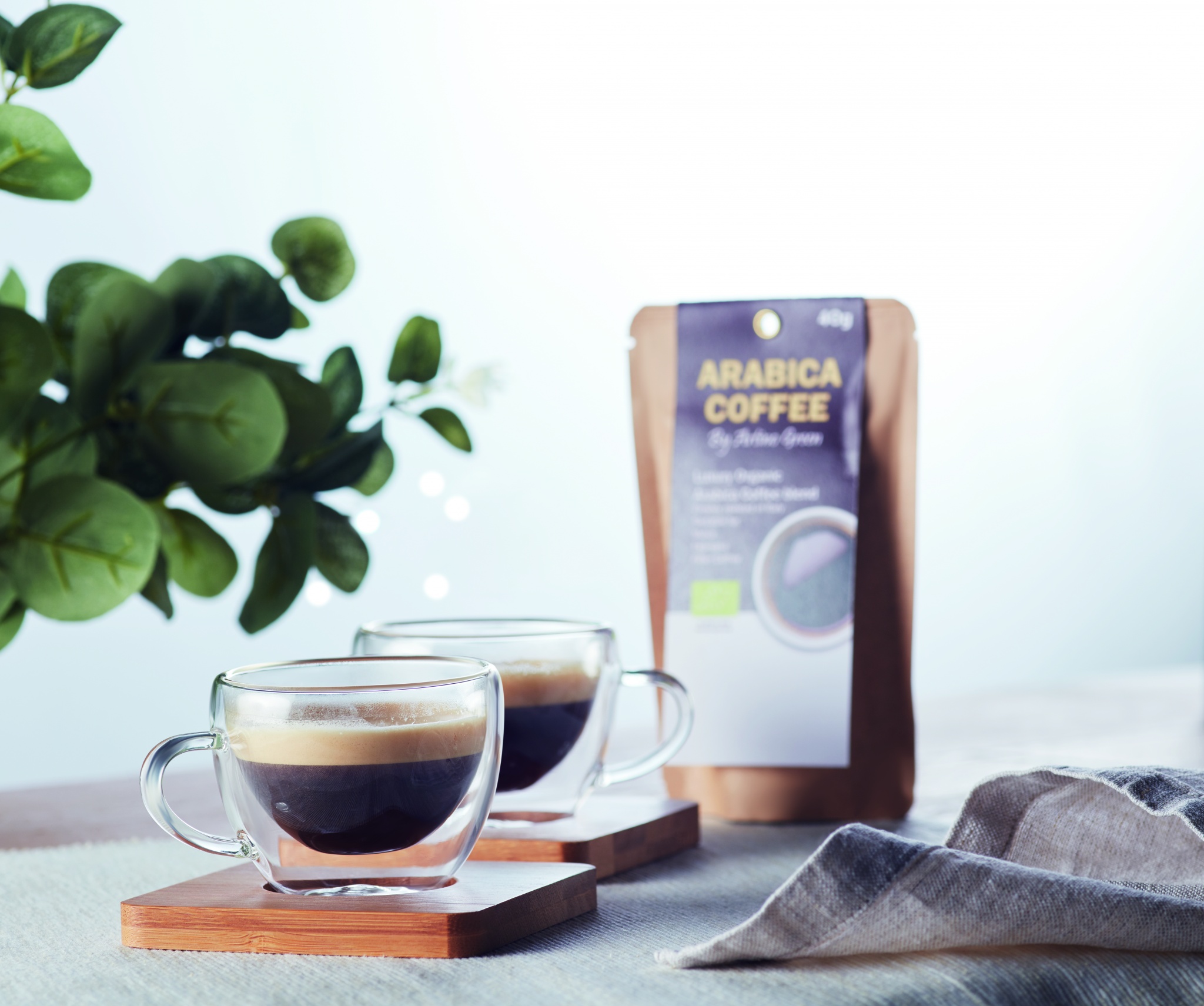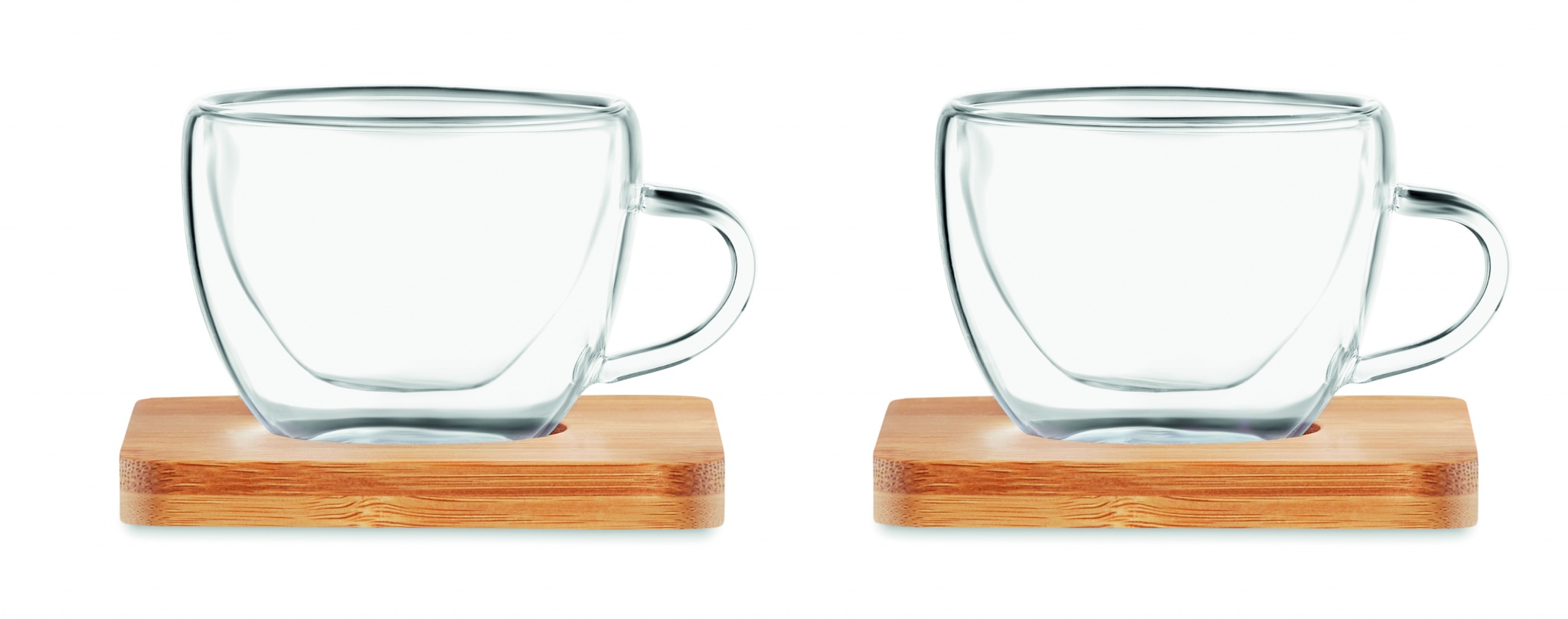 Набор из 2 чашек для эспрессо с блюдцем из бамбука. Представлено в коробке из крафт-бумаги. Емкость 60 мл.