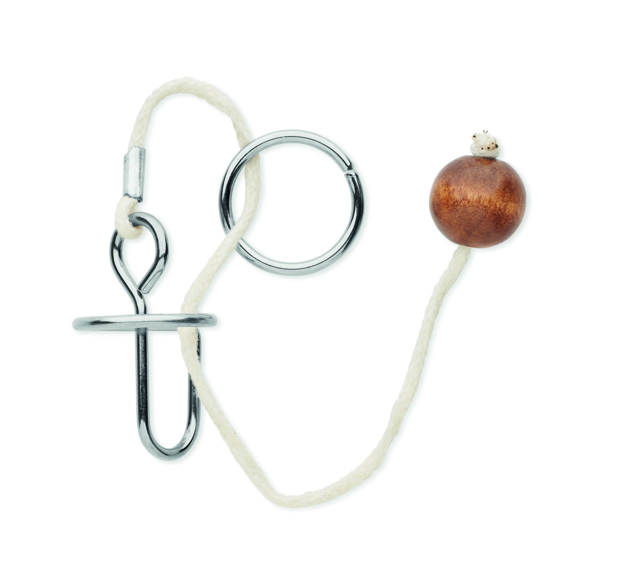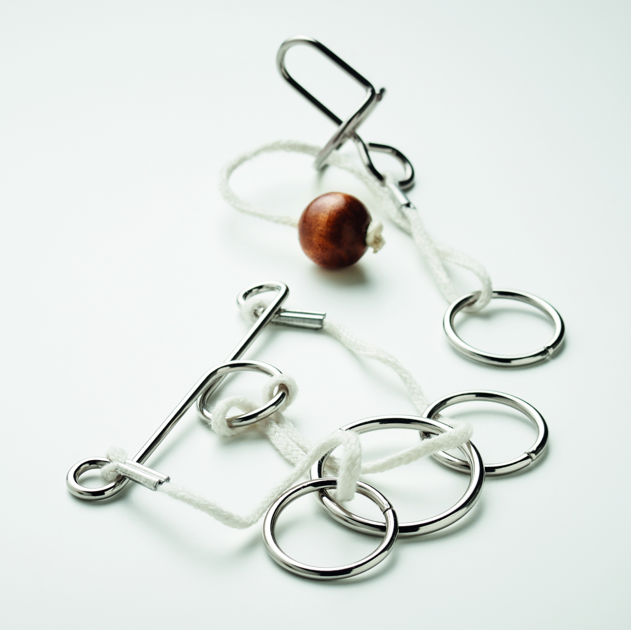 Набор головоломок из металлических, деревянных деталей и хлопкового ремешка. Представлены в коробке из переработанной бумаги.