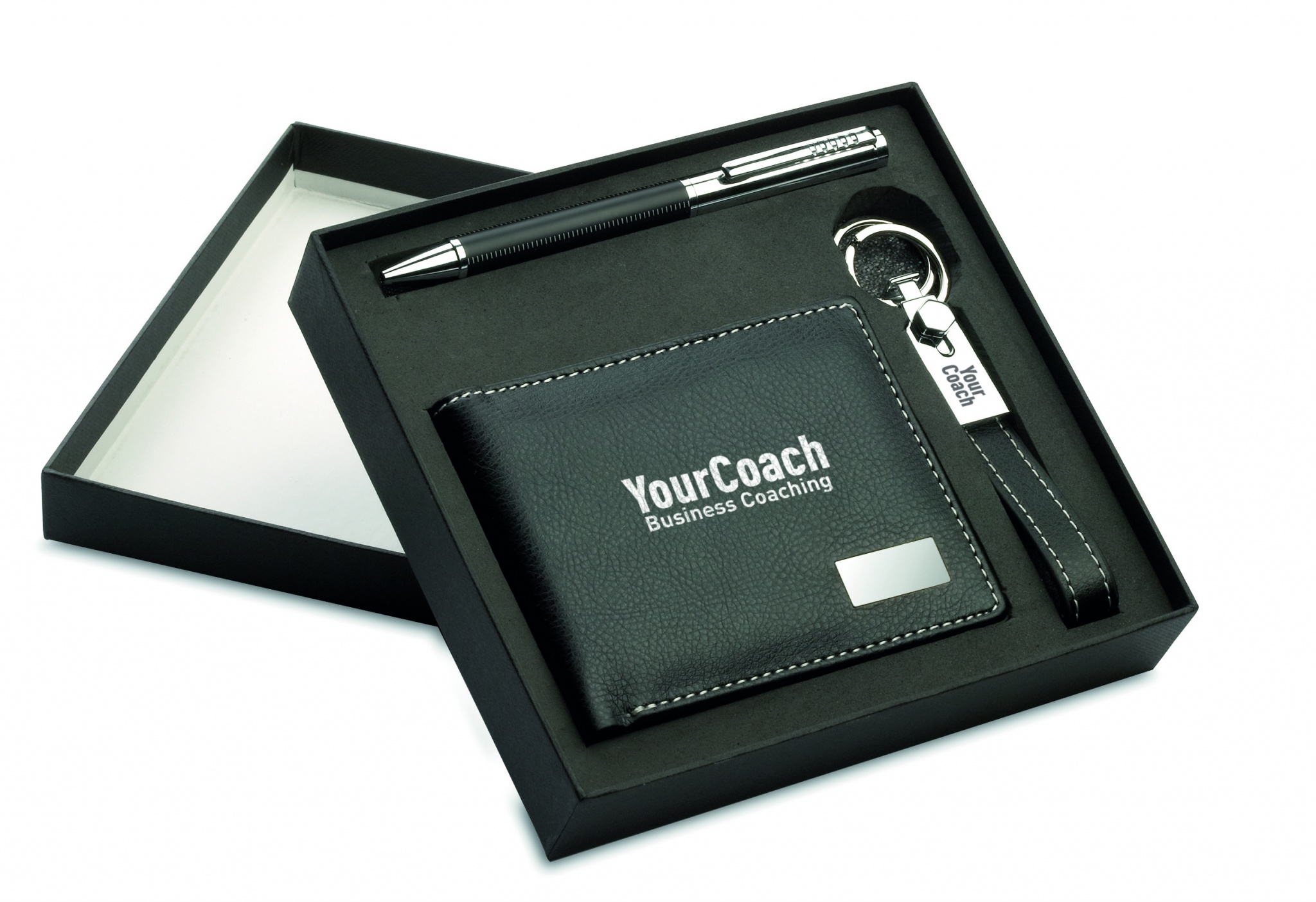 Элегантный подарочный набор в картонной коробке. Включает поворотную шариковую ручку с синими чернилами, стильный брелок для ключей и кошелек из искусственной кожи.
