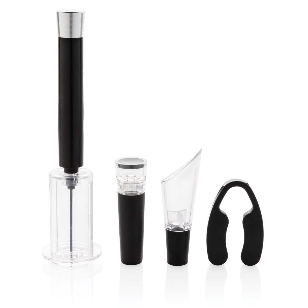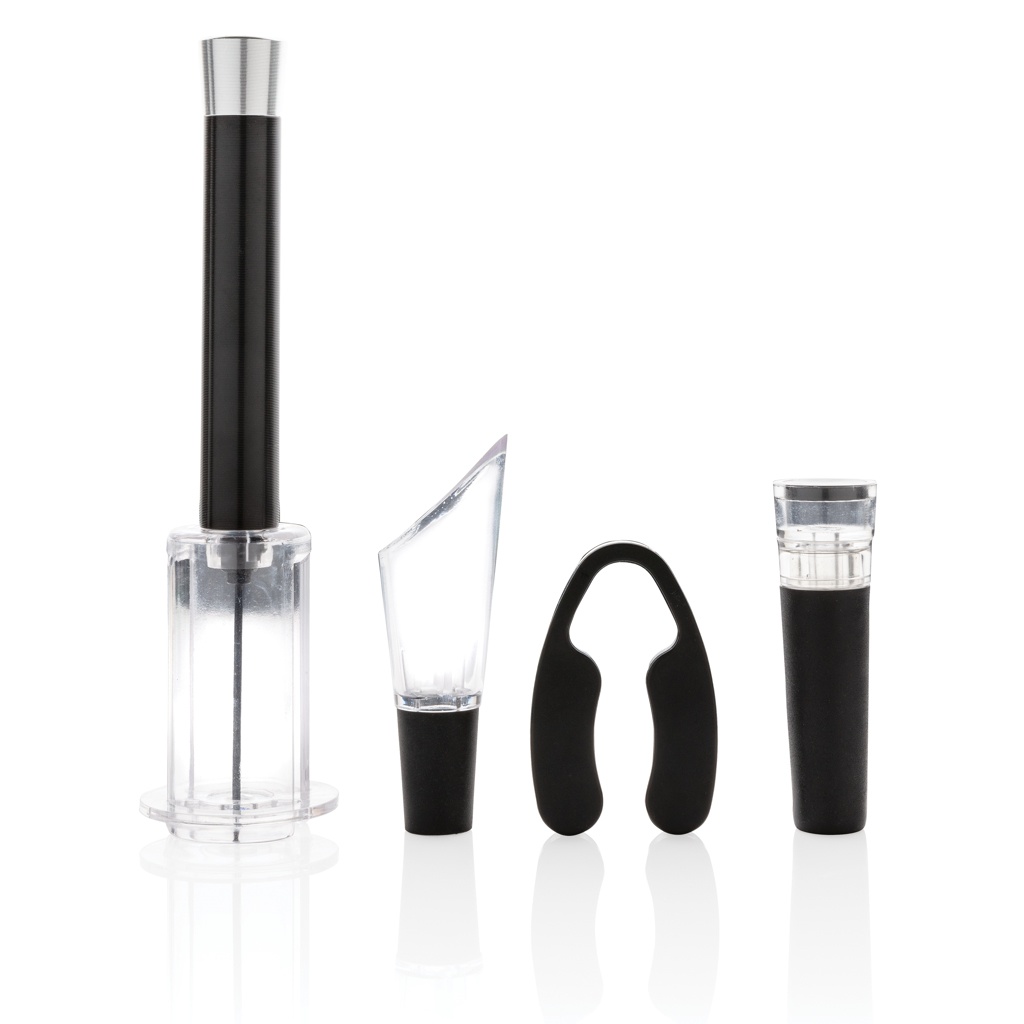 В этом наборе из 4 предметов для вина есть все необходимое для открытия, подачи и хранения любимых вин. В набор входят штопор с воздушным насосом, резак для фольги, винная пробка с вакуумным насосом и винный дозатор с аэратором. Упакован в роскошный подарочный тубус.