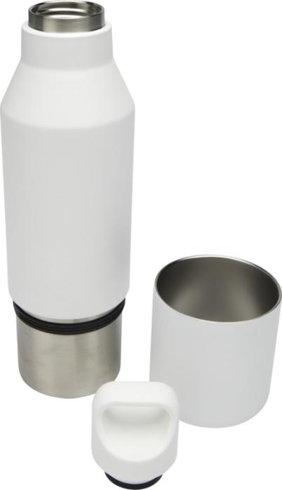 Бутылка из нержавеющей стали с двойными стенками и медной изоляцией, сертифицированная согласно RCS, со съемной крышкой. Эта многофункциональная бутылка помещается в боковой карман рюкзака и имеет удобную ручку для переноски, встроенную в крышку. Прочное порошковое покрытие снаружи. Напитки останутся горячими в течение 12 часов и холодными в течение 24 часов. Поставляется в подарочной коробке из переработанного картона. Объем бутылки: 600 мл. Объем кружки: 300 мл.