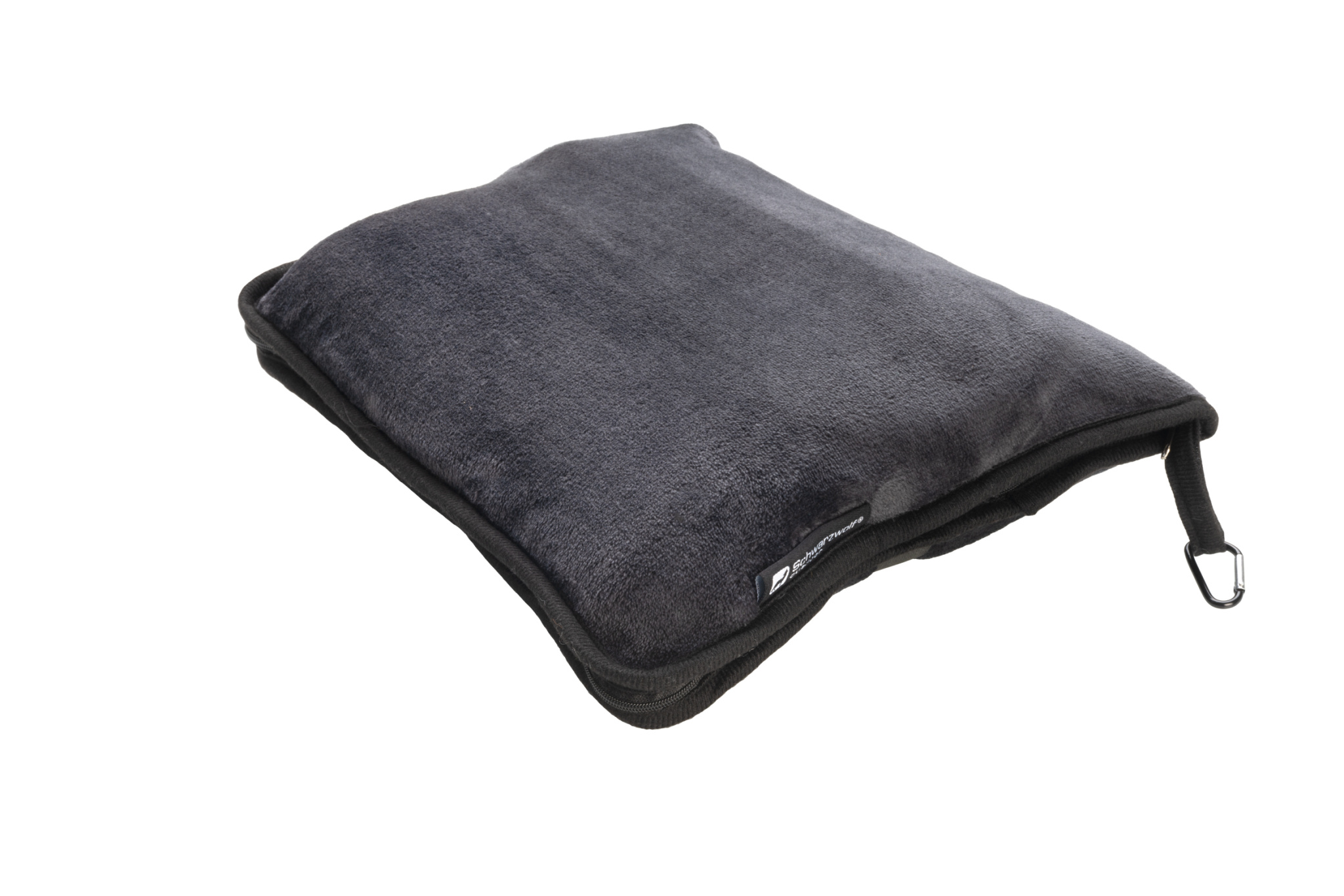 Флисовое дорожное одеяло Schwarzwolf 2in1, которое можно использовать как одеяло или сложить в чехол из того же материала и превратить его в удобную подушку. Одеяло выполнено в темно-сером цвете и может использоваться во время путешествий или быть упакованным как компаньон во время кемпинга. Чехол для сложенного одеяла включает карабин для крепления к багажу.