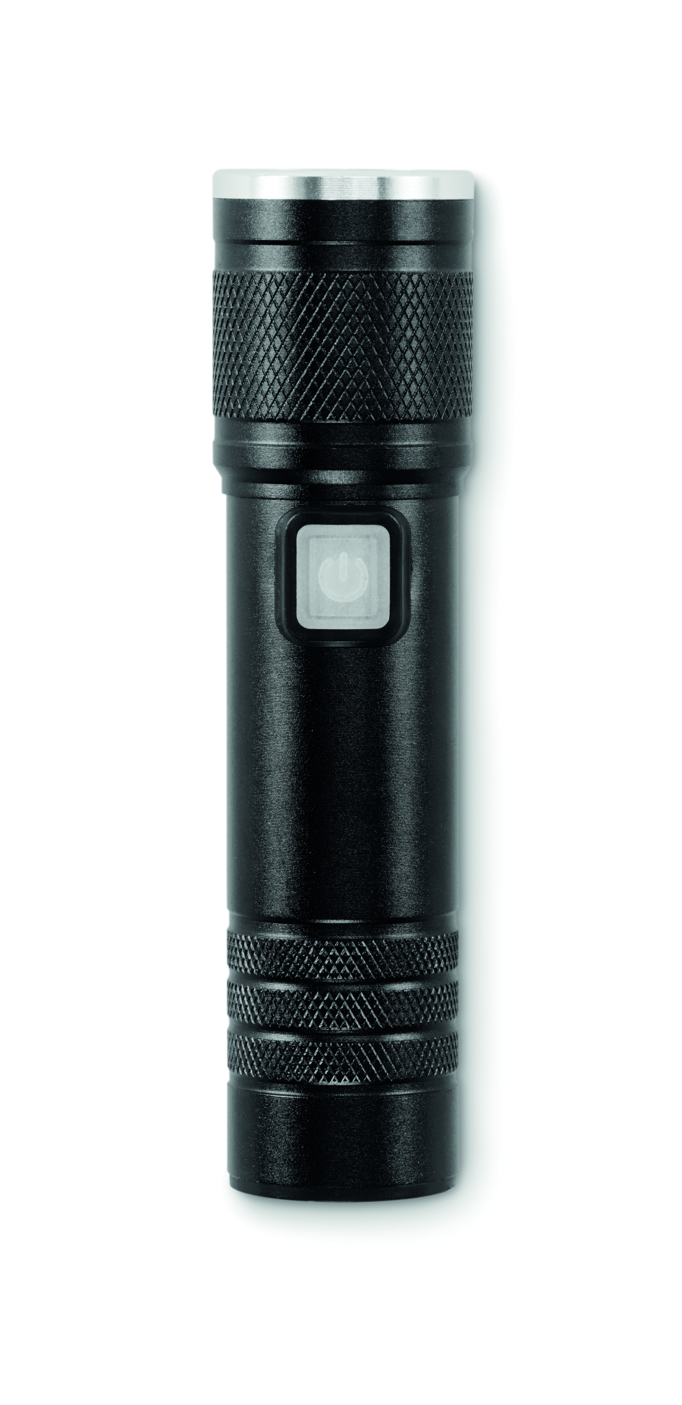 Rechargeable and expandable COB light torch in recycled aluminium. 100 lumen with 3 light settings and zoom function. Built-in 800 mAh rechargeable battery. Charging cable included.