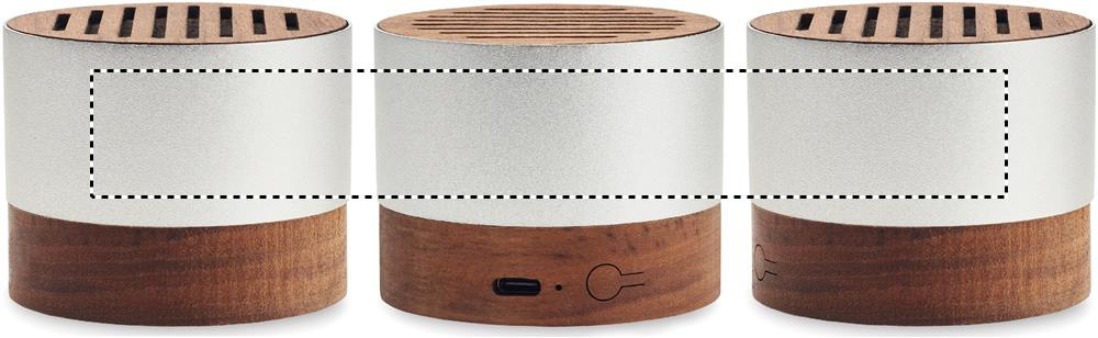 5.3 wireless speaker in recycled aluminium casing with walnut base and top detail. 1 Rechargeable Li-ION 300 mAh battery included. Output data: 3W, 3 Ohm and 5V. Playing time approx. 3h.