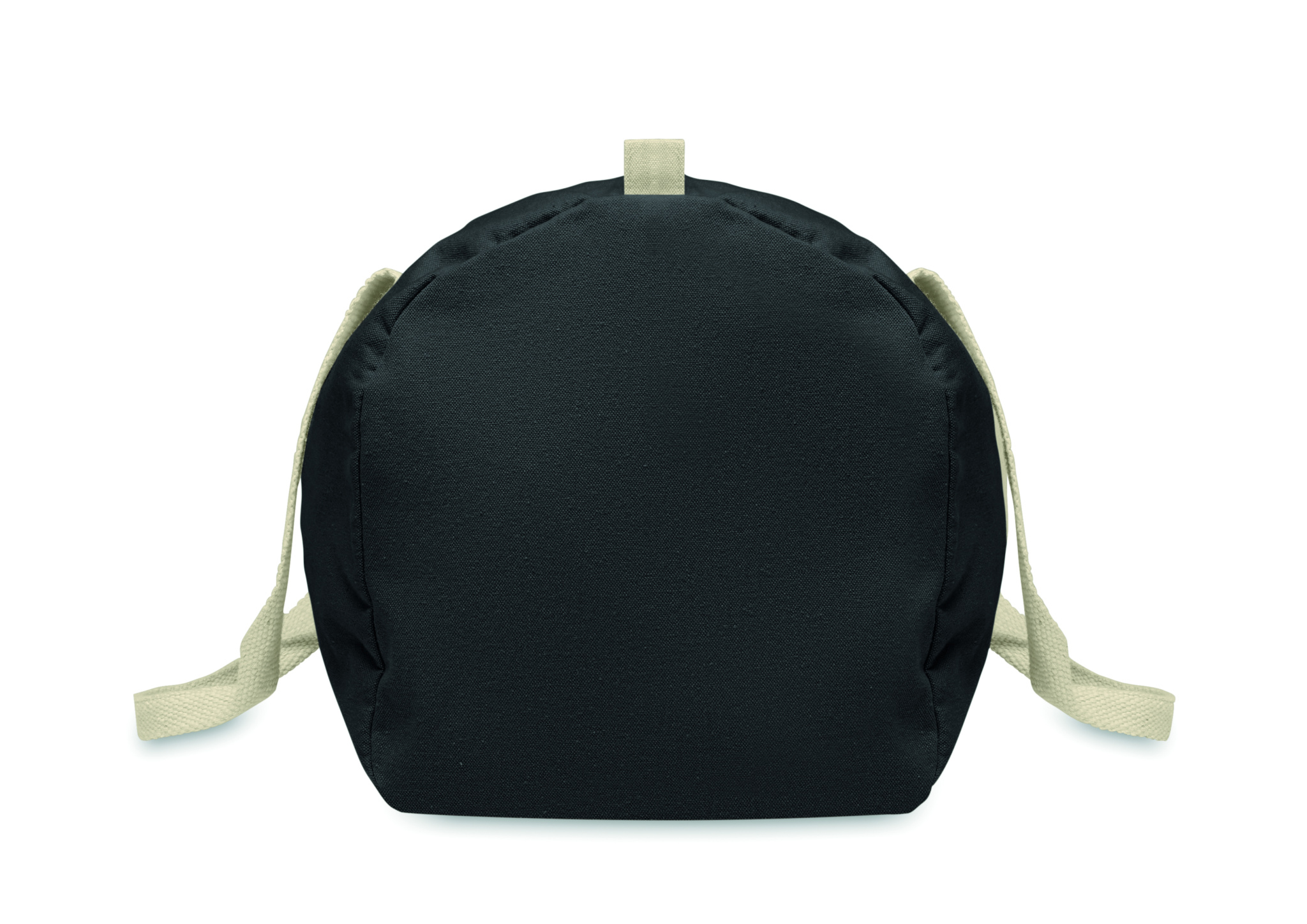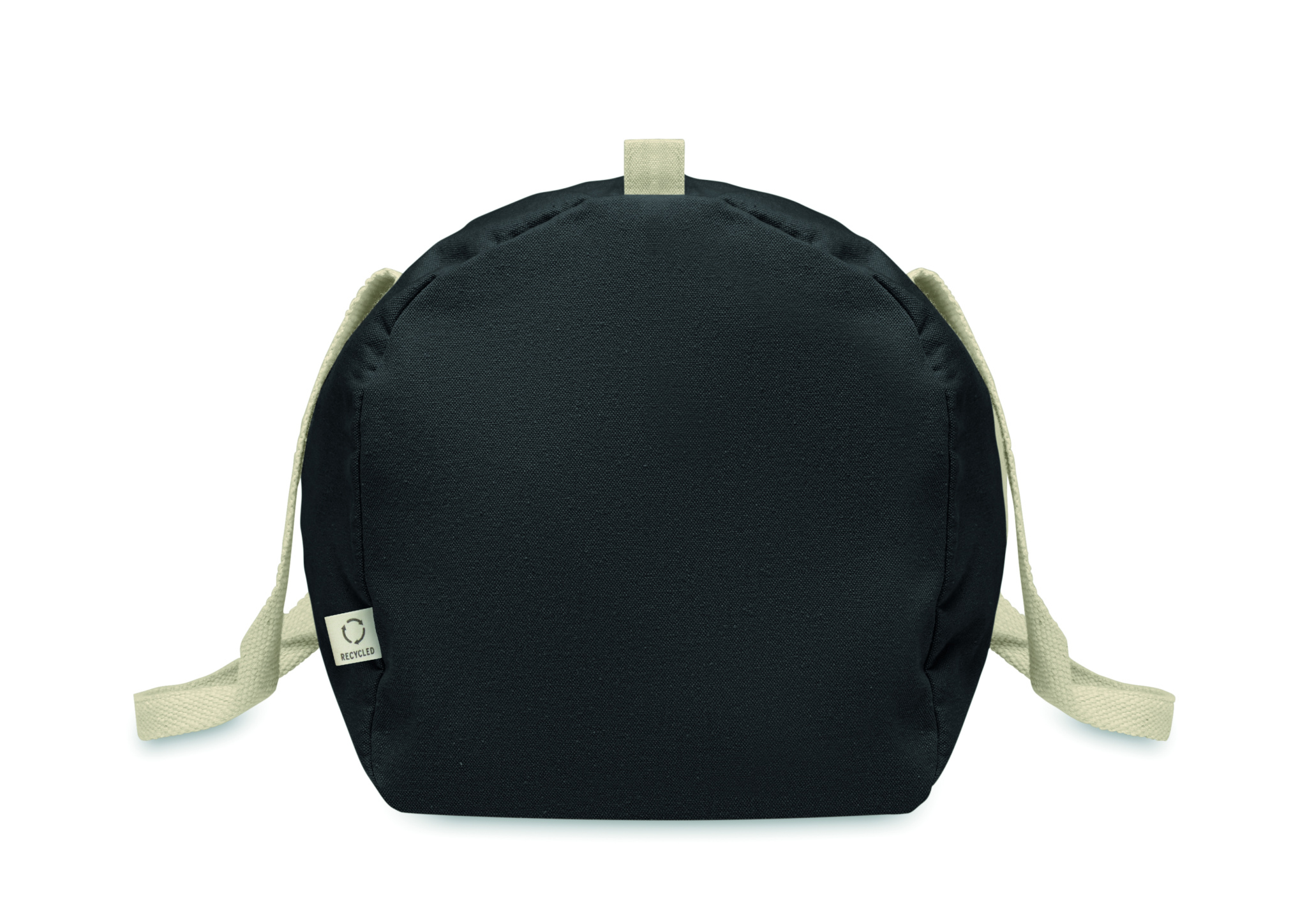 Duffle, sports or travel bag with zippered side compartment and zippered inner pocket in 320 gr/m² recycled cotton (80%) and recycled polyester (20%) with long handles.