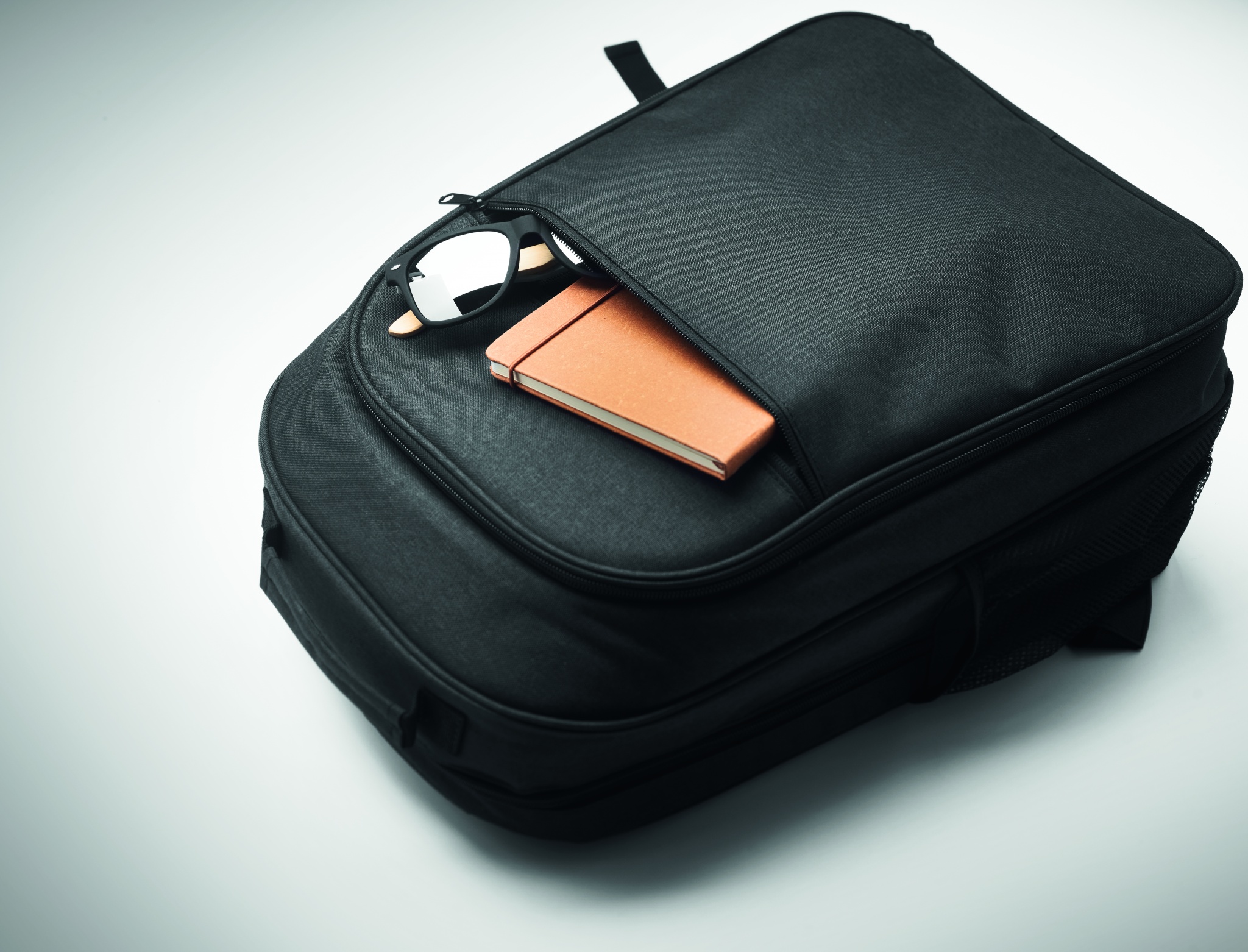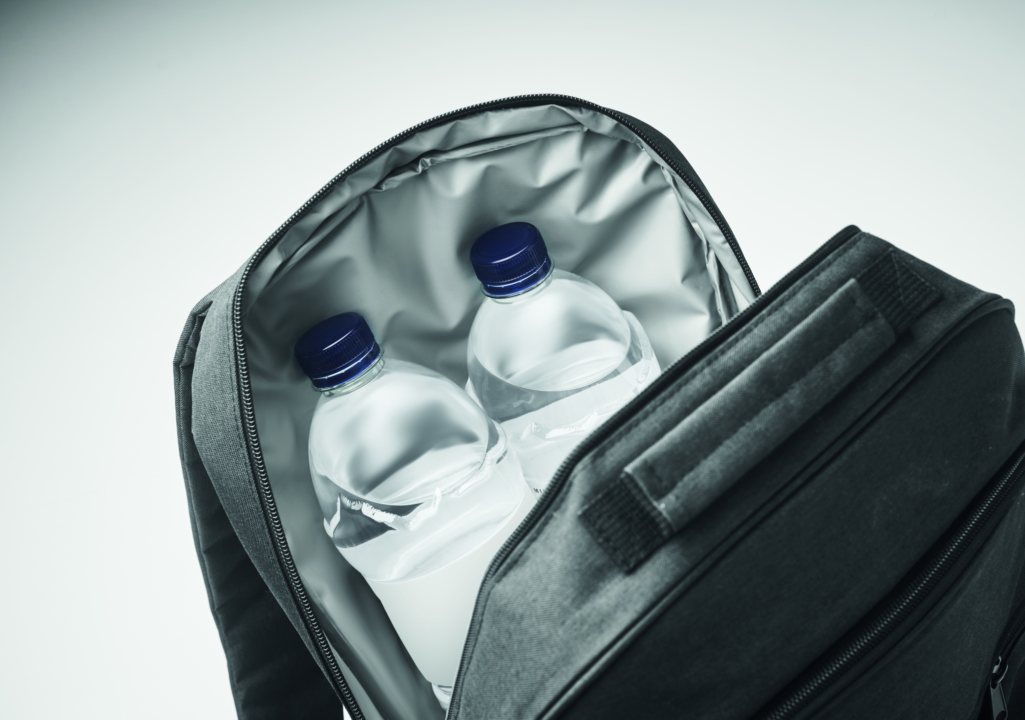 Терморюкзак из 300D RPET с отделением для 15-дюймового ноутбука. Передний карман на молнии и одно боковое сетчатое отделение.