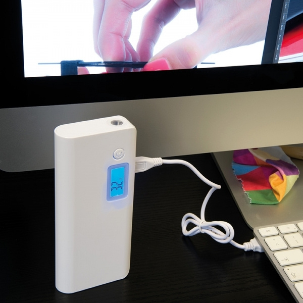 Power Bank емкостью 10.000 мАч, USB-кабель для зарядки и цифровой дисплей для отображения оставшегося заряда. С помощью этого пластикового power bank вы можете заряжать свой смартфон несколько раз. Мы напечатаем ваш логотип сверху.