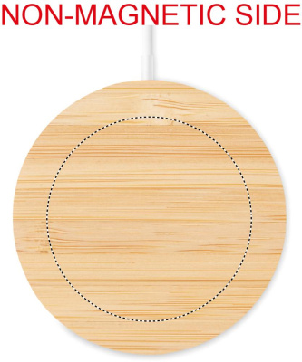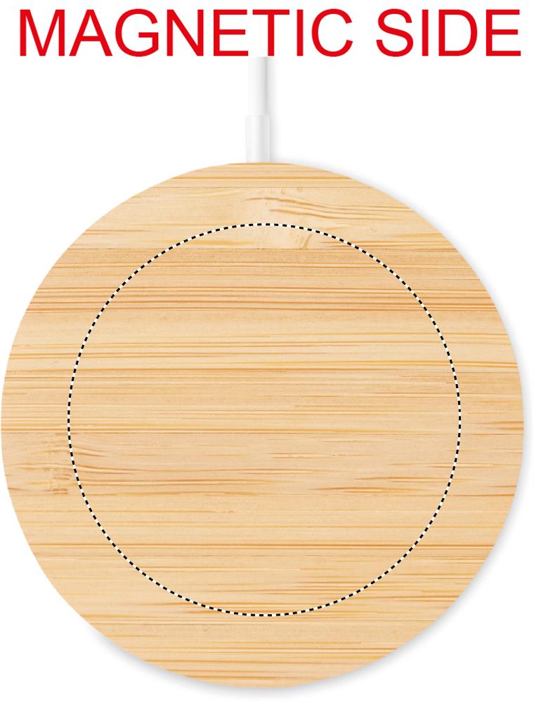 Бамбуковое б/п зарядное устройство с магнитом. Выход: 9В АС/1,1А (10 Вт) для быстрой зарядки. Совместимо с iPhone® 12 и новее. Есть еще доп. магнитное кольцо для б/п зарядки других смартфонов