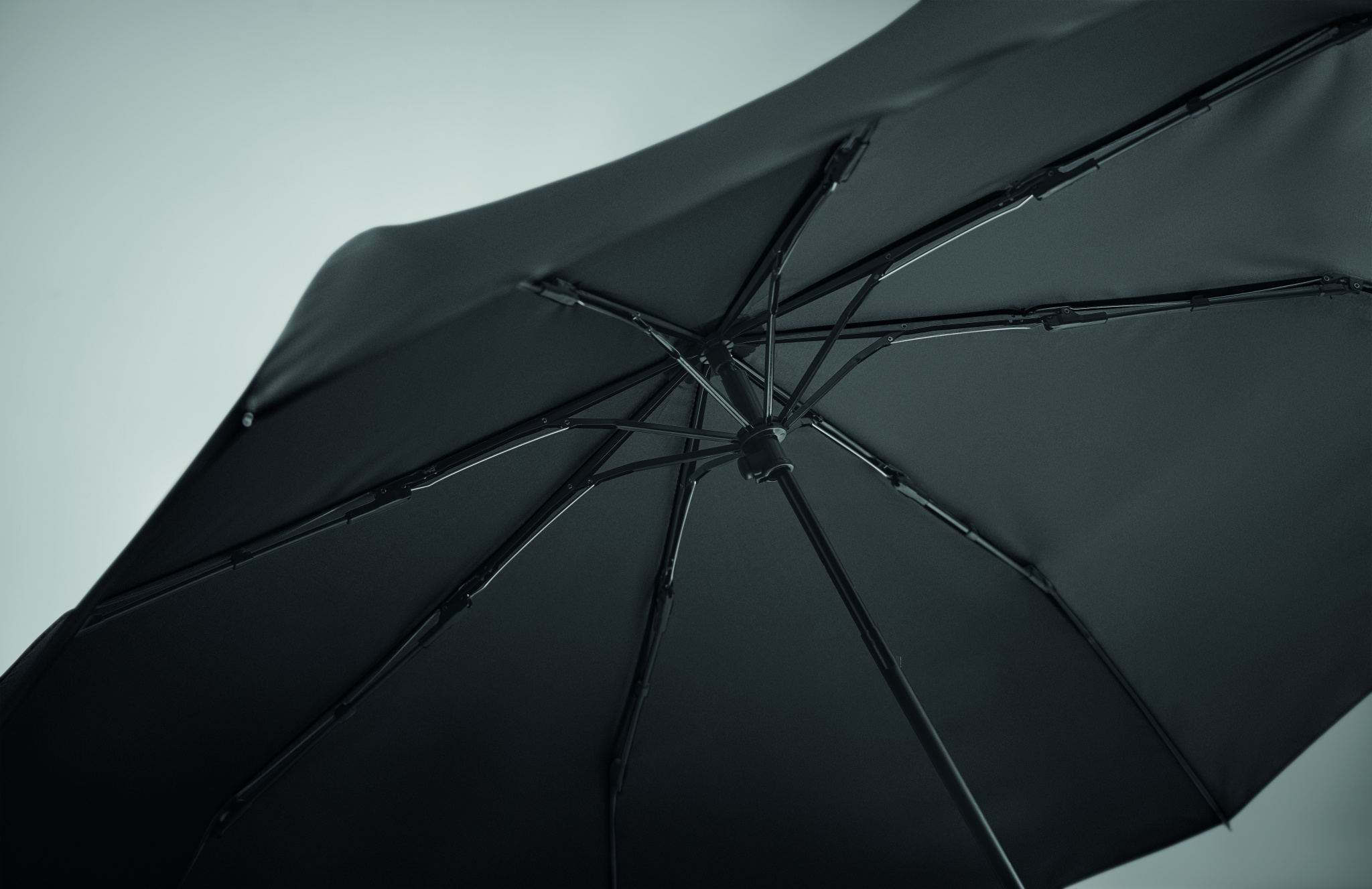 21 tum 3-delat paraply med manuellt öppnings- och stängningsbart, stormsäkert i 190T RPET pongee inklusive tygväska. Har ett dolt blixtlåsförsett fack för paraplyet och för att hålla väskans innehåll torrt. När väskan inte används rullas den ihop och blixtlåsfacket fungerar som paraplyfodral.