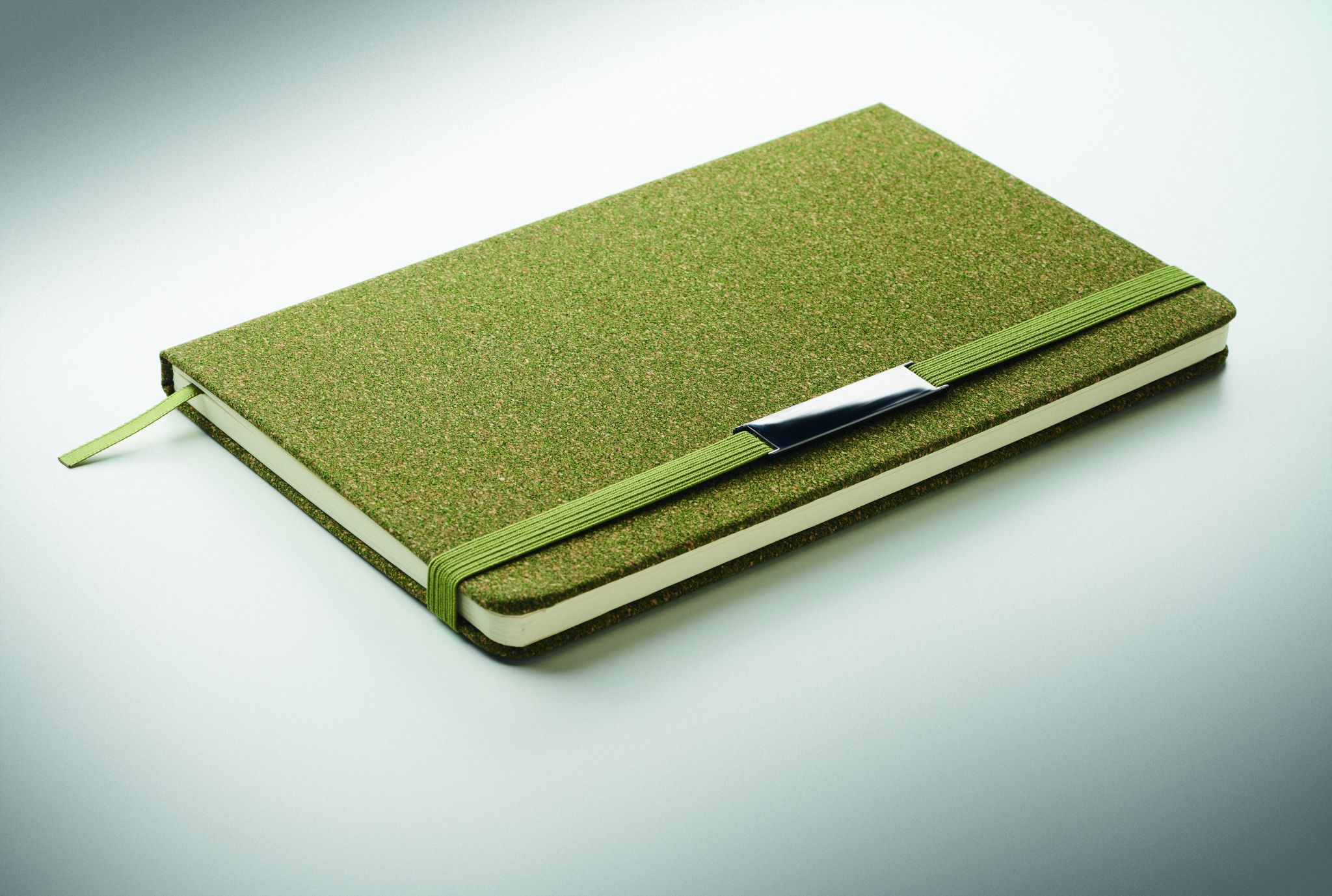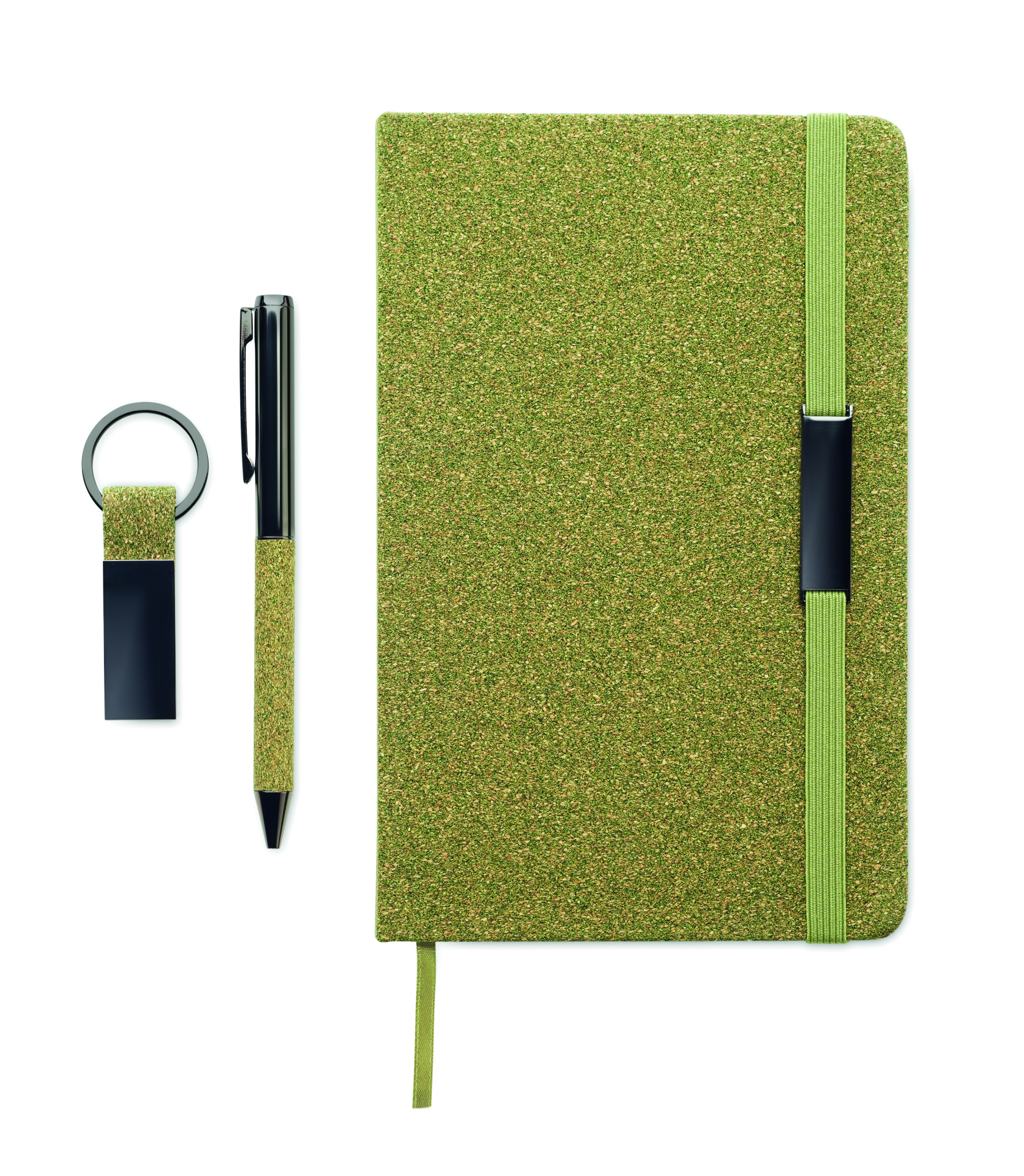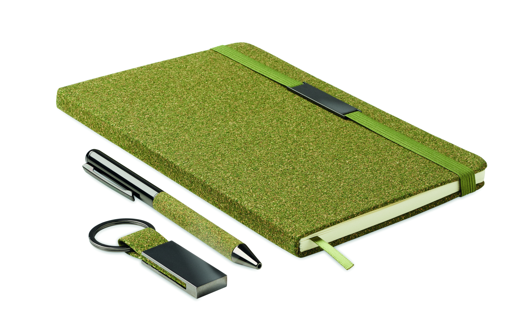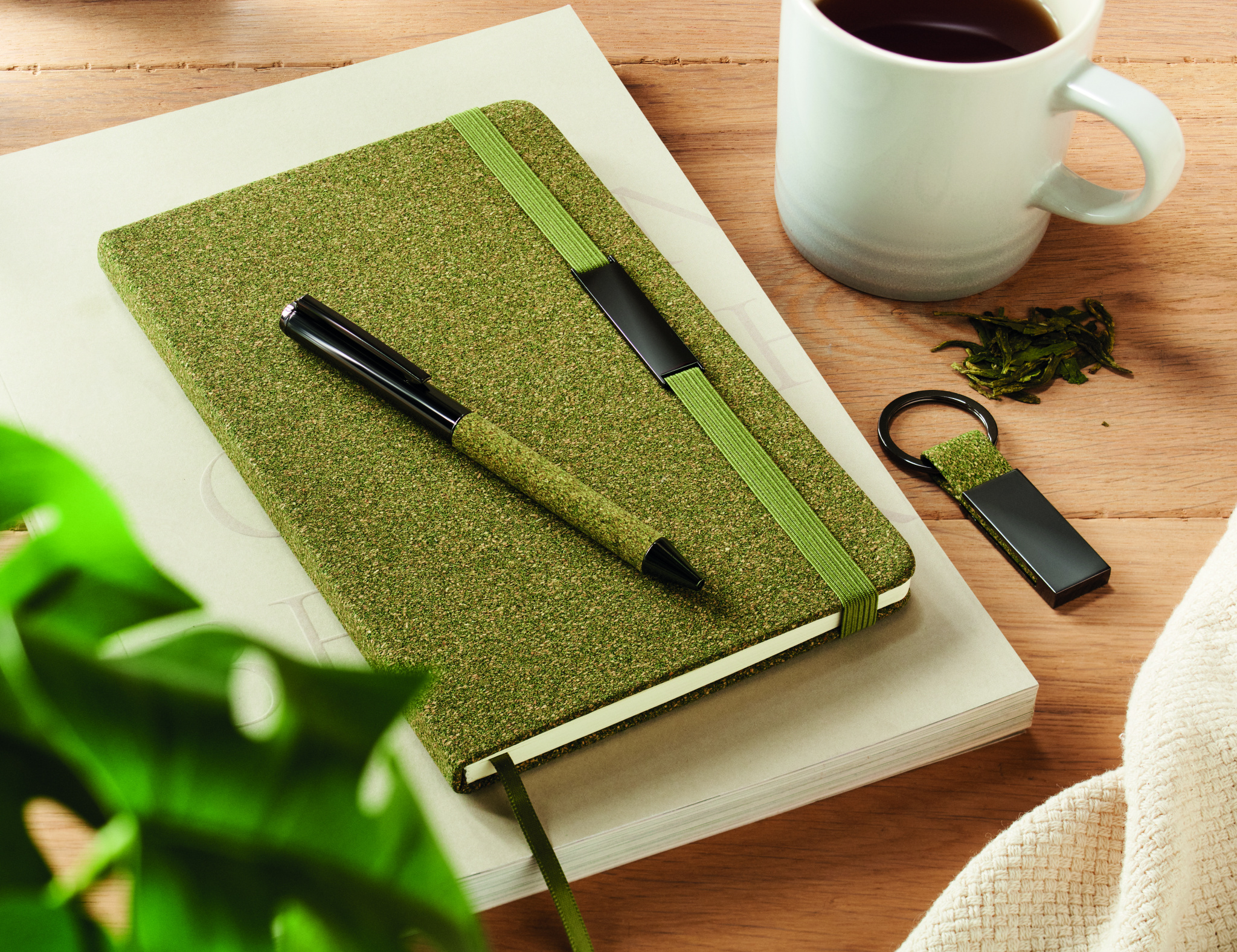 Set med A5 anteckningsbok med hårt omslag och 160 linjerade sidor av återvunnet papper (80 ark/70 gsm), metallpenna med vridfunktion och nyckelring. Detalj tillverkad av 20% tesump, 30% kork, 50% polycottonväv. Metalldetalj på elastisk rem. FSC®-certified | FSC MIX CREDIT, N7.1, FSC-C213206