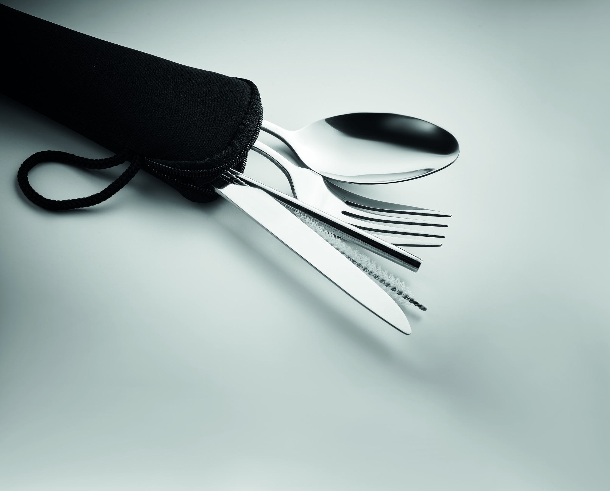 Bestick set av rostfritt stål inklusive gaffel, kniv, sked, sugrör och borste i neoprenpåse.