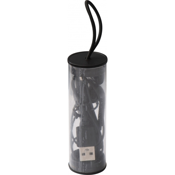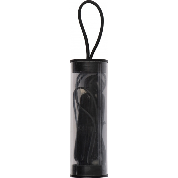 Bluetooth-headset med volymkontroll och USB-laddningskabel i plastfodral med upphängningsögla. Vi kommer att trycka din logotyp på fodralet.
