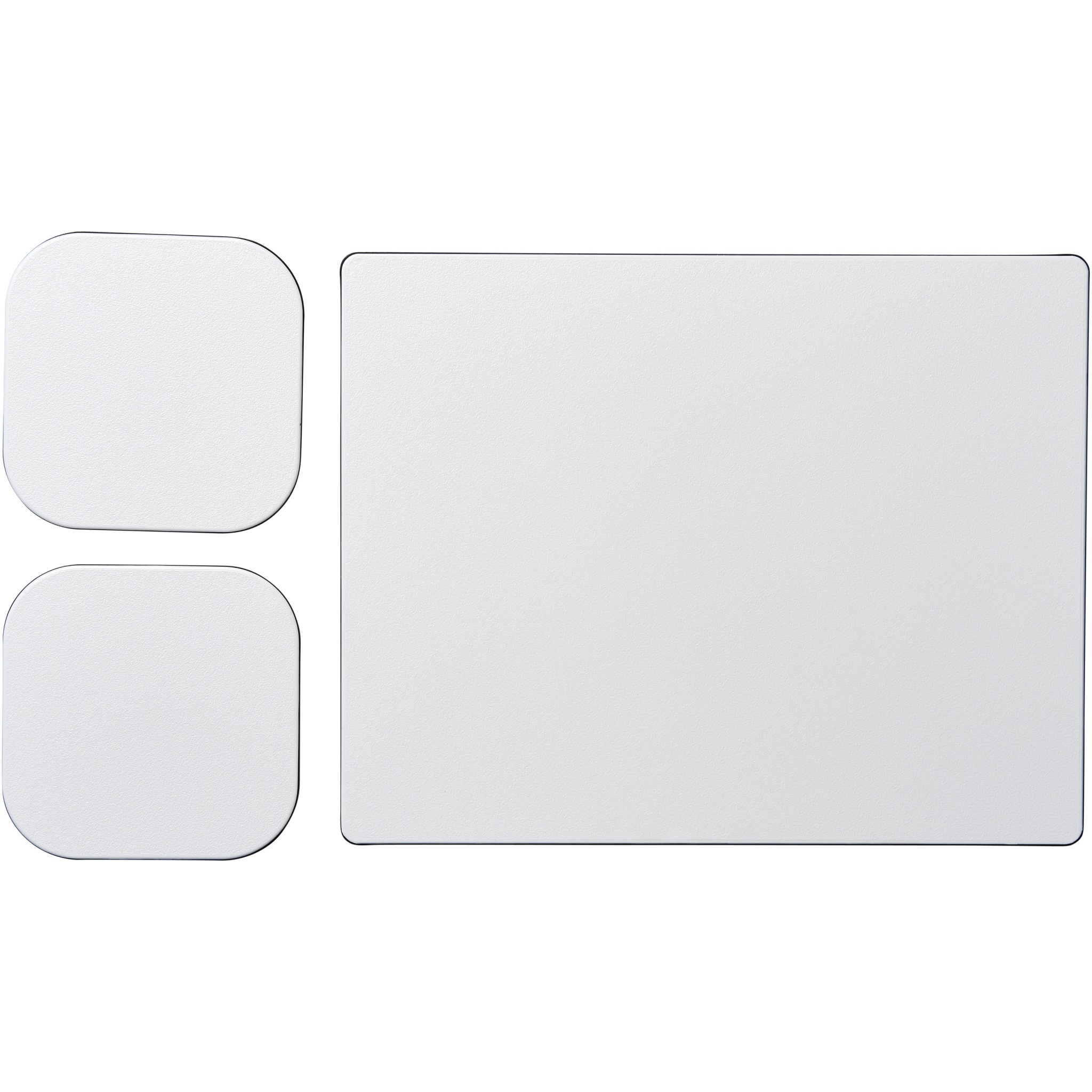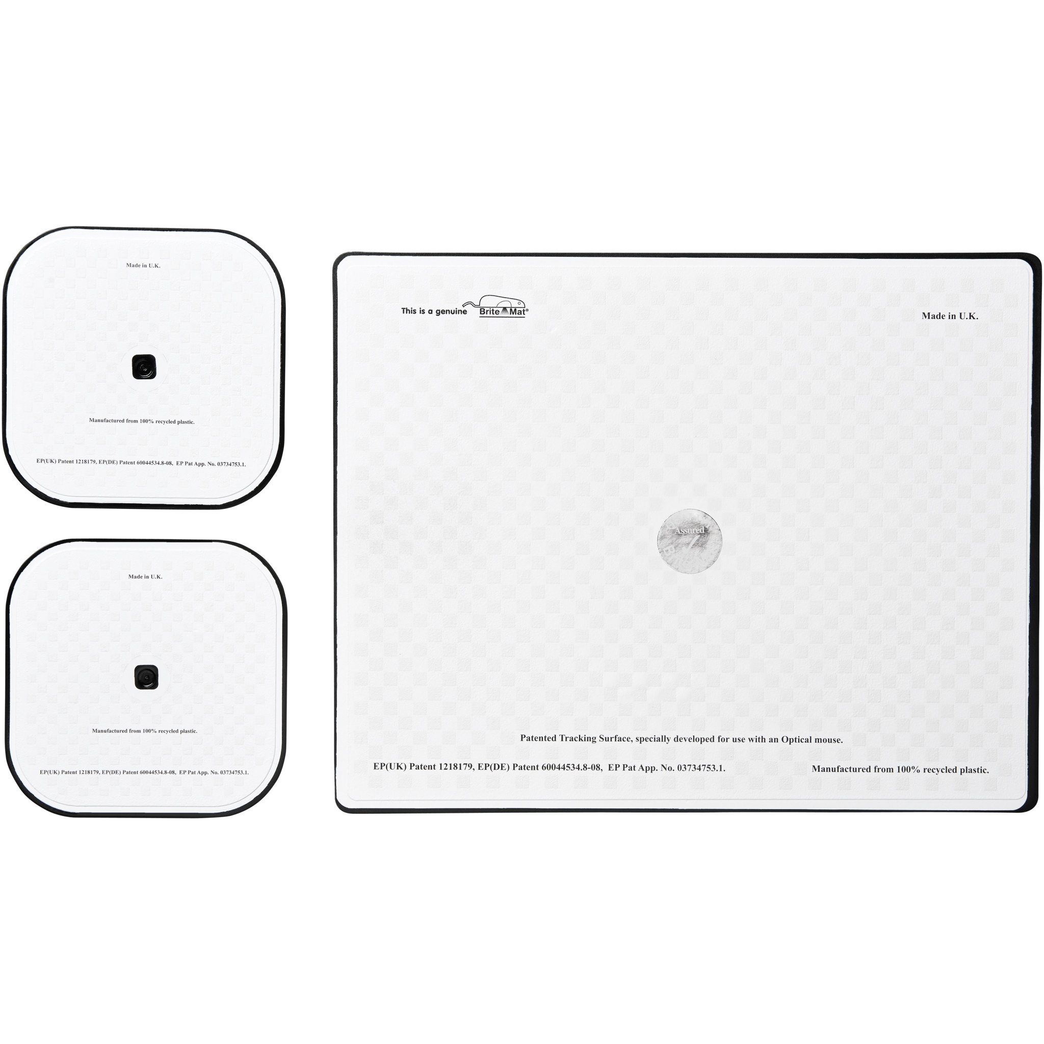 Brite-Mat® Set 3 med musmatta och underlägg. Set med Brite-Mat-musmatta och matchande underlägg. Setet består av en rektangulär musmatta (0,3 x 19 x 24 cm) och två kvadratiska underlägg (0,3 x 9,5 x 9,5 cm). Återvunnen plast, glanspapper och svart plastgranulat.