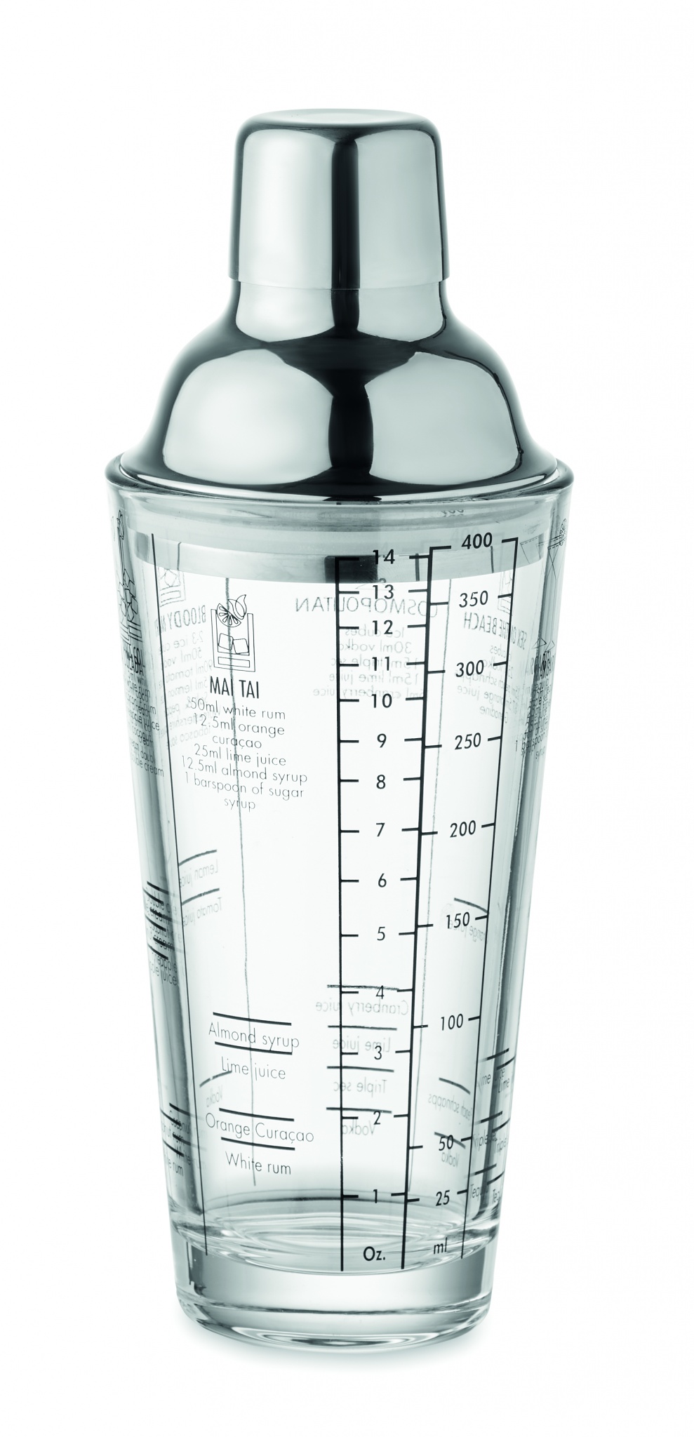 Snygg cocktailshaker i glas med lock i rostfritt stål. Tryckta cocktailrecept och mått på glaset. Kapacitet: 400 ml.