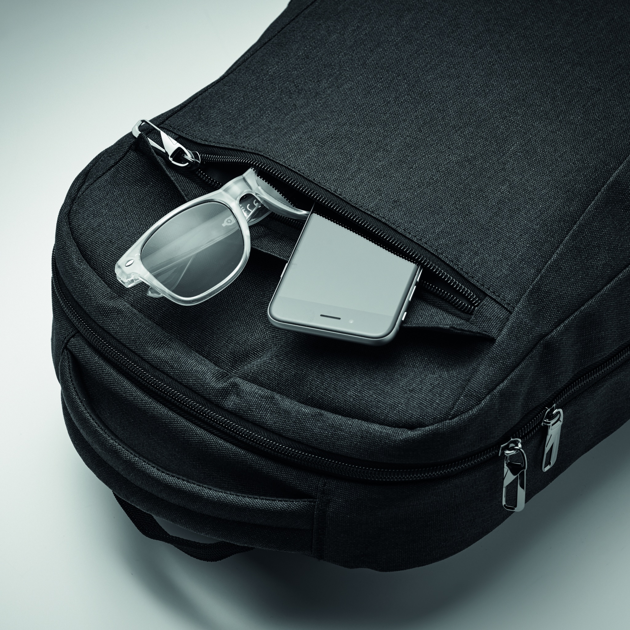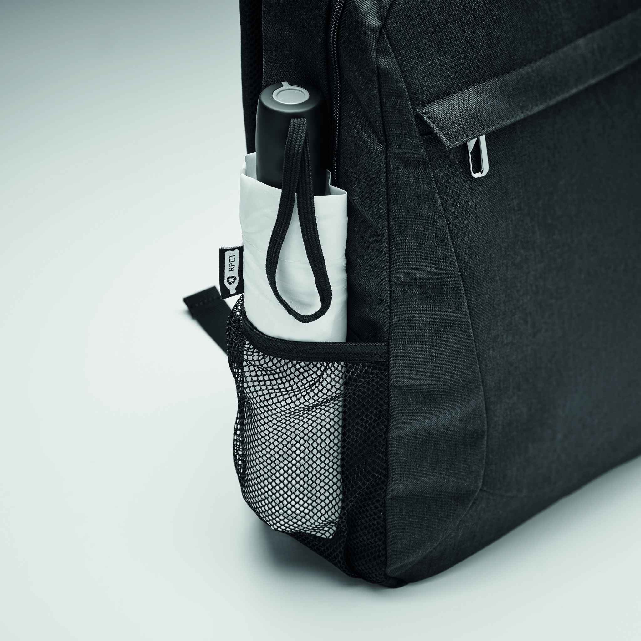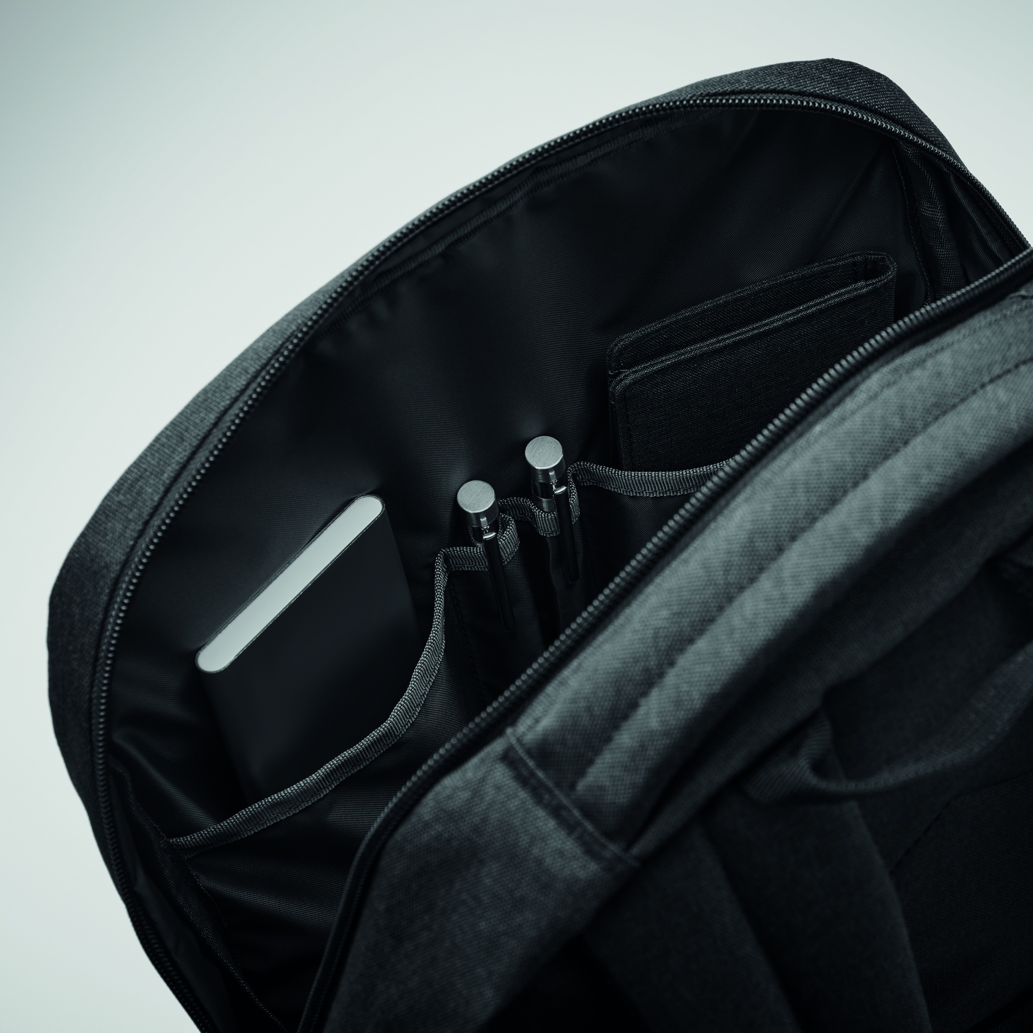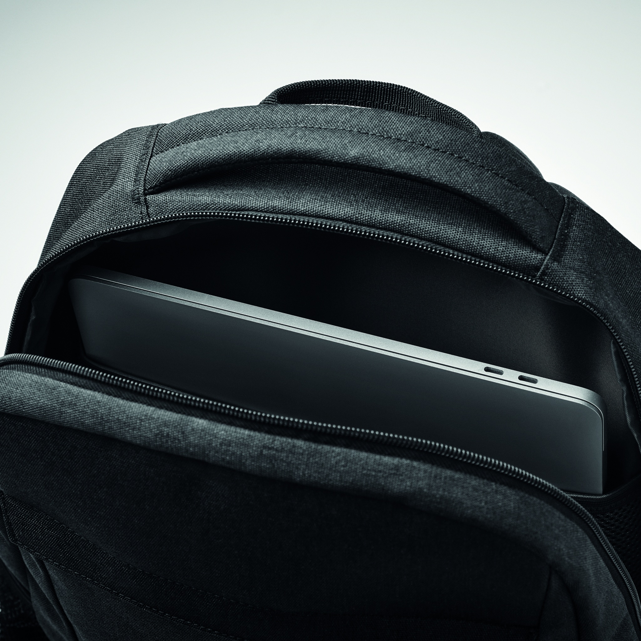 Ryggsäck med plats bärbar dator på 15 tum i 600D RPET-polyester. Invändigt fack för bärbar dator och små flera innerfack. Den har en ficka med dragkedja på framsidan och 2 nätfickor på sidan. Justerbara axelremmar. Trolleyhållare på baksidan.