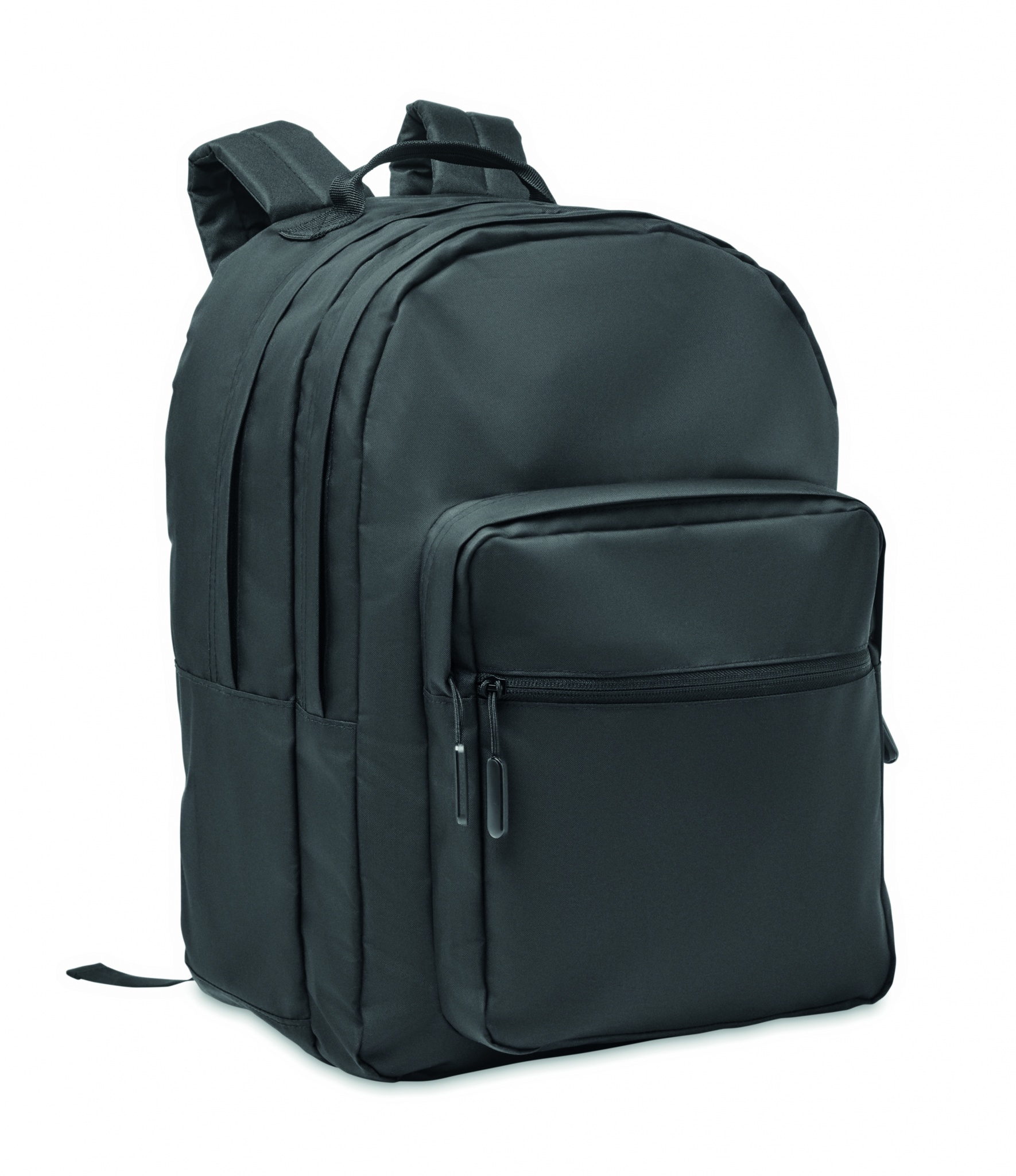 Dataryggsäck för 15 tums datorer. Gjord i 300D RPET polyester. Den har 2 stora fack med dragkedja, dubbla framfickor med dragkedja och sidoficka med meshnät. Vadderade rygg- och axelremmar.