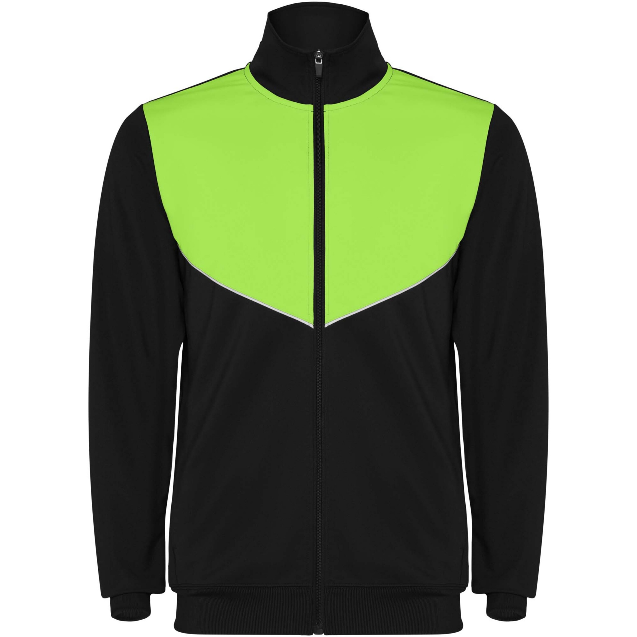 Träningsoverall i lätt och elastiskt tyg. Jacka med kontrasterande färg och sömnadsband på bröstet. Hög krage med kontrasterande sömmar. Dragkedja mitt fram. Sidofickor. 2 x 2 ribbade muddar och midja. Byxor med elastisk linning och dragsko. Kontrasterande sidostycke med sömnadskant. Dragkedja i fåll.