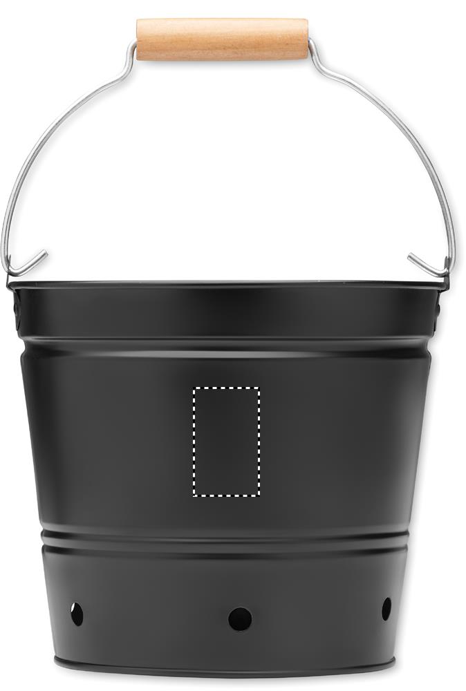 Bärbar hinkgrill i järn med grill i rostfritt stål med trähandtag.