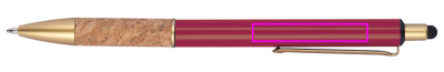 Metallkulpenna med gyllene applikationer, blåskrivande refill och korkgreppszon. Din logotyp kommer att graveras till höger om klippet.