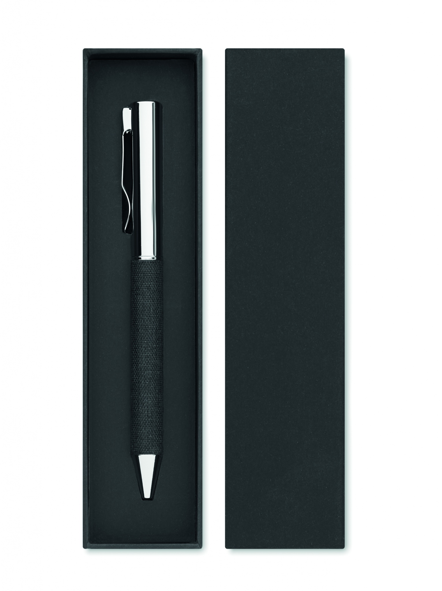 Kulspetspenna med vridfunktion i metall med RPET-polyesterdetaljer. Levereras i presentförpackning. Blått bläck.