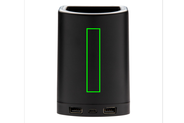 Ladda din mobila enhet utan att ansluta några kablar med denna unika 2 i 1 skrivbordsaccessoar. Placera din mobiltelefon på stället och vänta på att laddningsindikatorn tänds. Finns plats för förvaring av pennor. Du kan gravera din logga på produkten och när den är ansluten lyses loggan upp och ger optimal exponering. 2 USB-portar för laddning via kabel. Kompatibel med alla QI-aktiverade enheter som senaste generationen Android, iPhone 8 och upp. Input: 5V/3A. Trådlös Output: 5V/1A 5W. 150 cm micro USB kabel medföljer