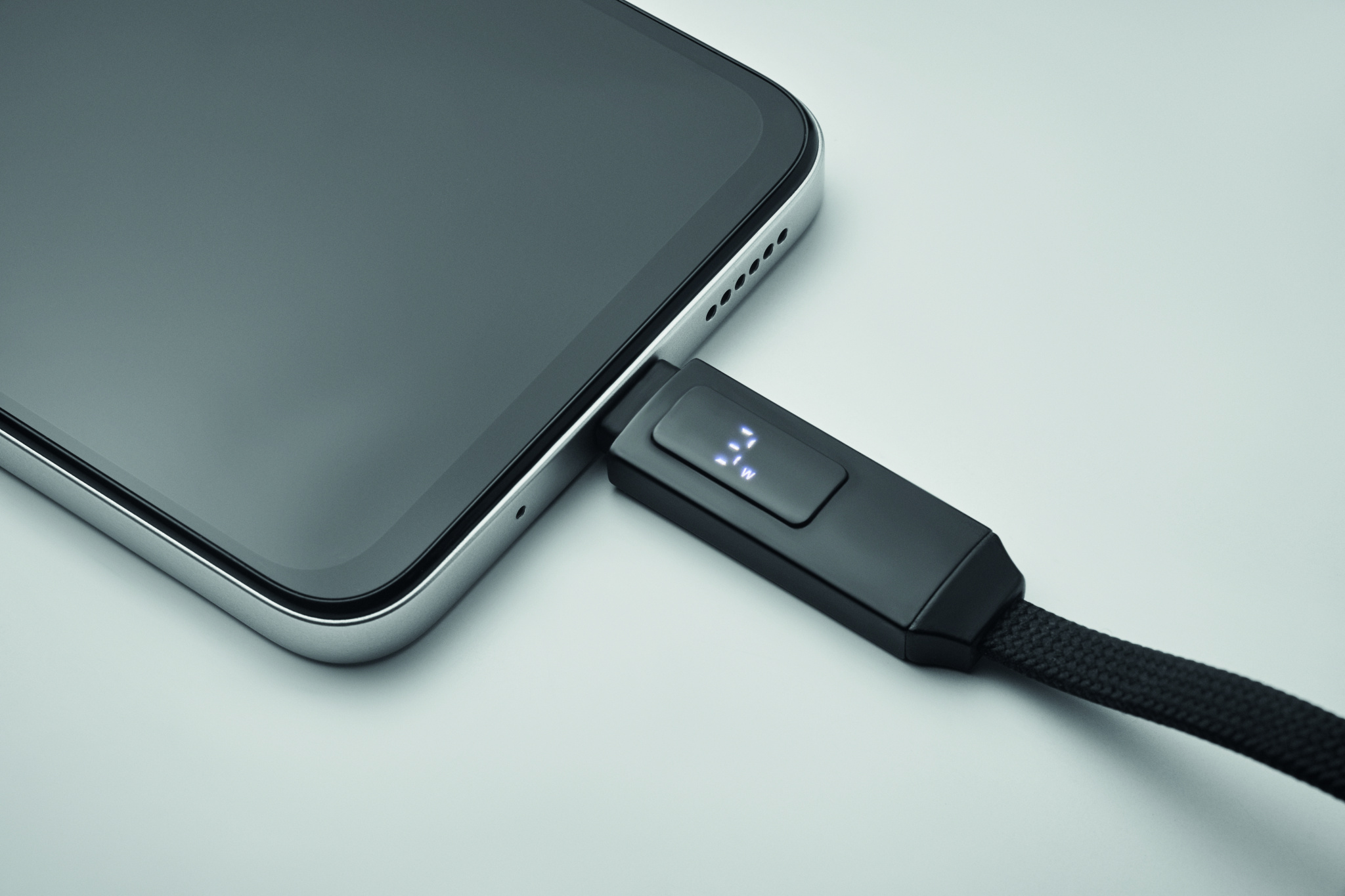 60W laddnings- och datakabel med nyckelring. Typ-C till typ-C med LED-skärm med funktion för visning av laddningseffekt. Magnetisk stängning.