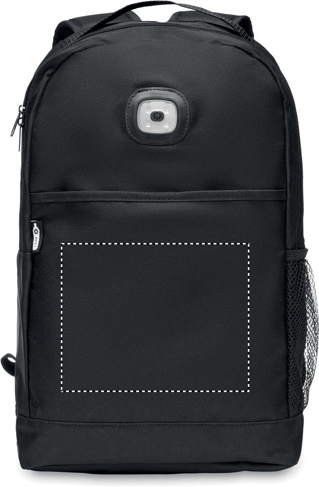 Ryggsäck i 600D RPET, framficka med kardborrstängning, nätficka på sidan och COB-ljus på frontpanelen som kan tas av. Har fast eller blinkande sken. COB-lampa med vitt ljus med tre olika ljusinställningar. Knappcellsbatteri ingår. Mått: 28x34x13cm, Volym ca 12,5L