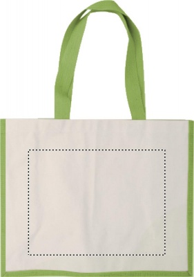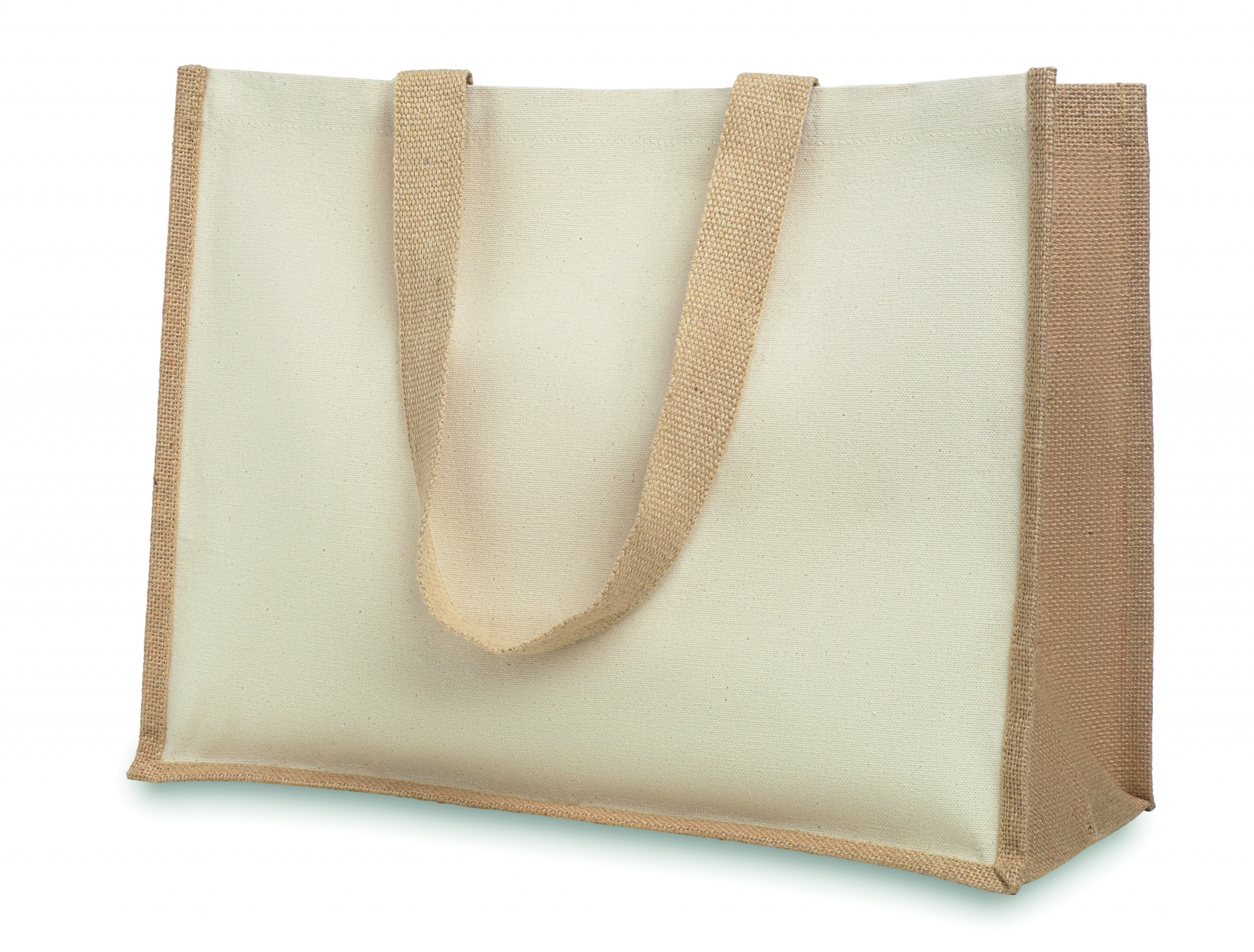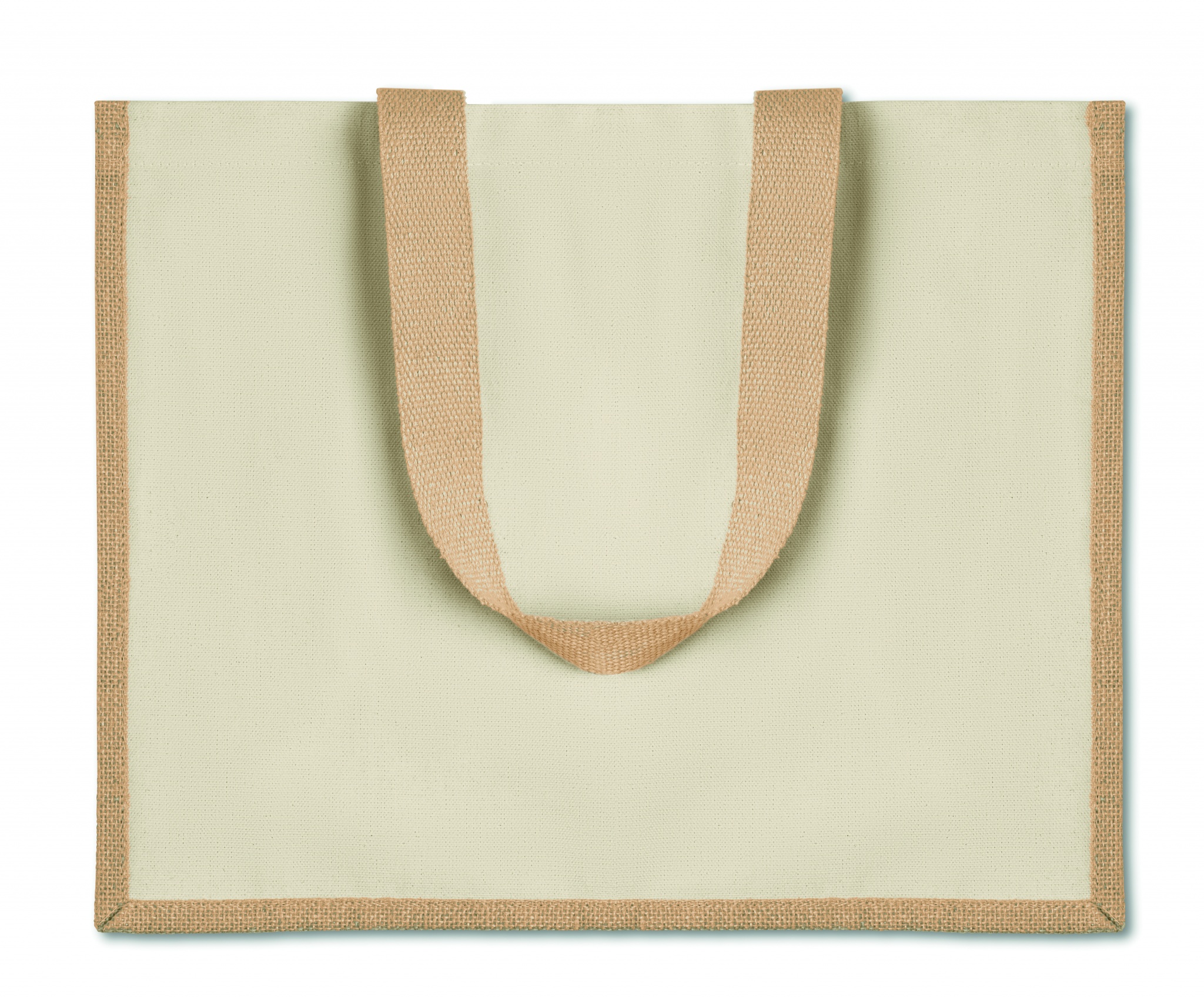 Shoppingkasse i laminerad Jute med front i canvas och bomull. Långa handtag.