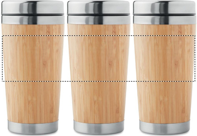 Termosmugg i rostfritt stål med utsida i Bambu. Dubbla väggar för bättre värmeisolering. Fungerar för både varma och kalla drycker. Volym: 400ml.