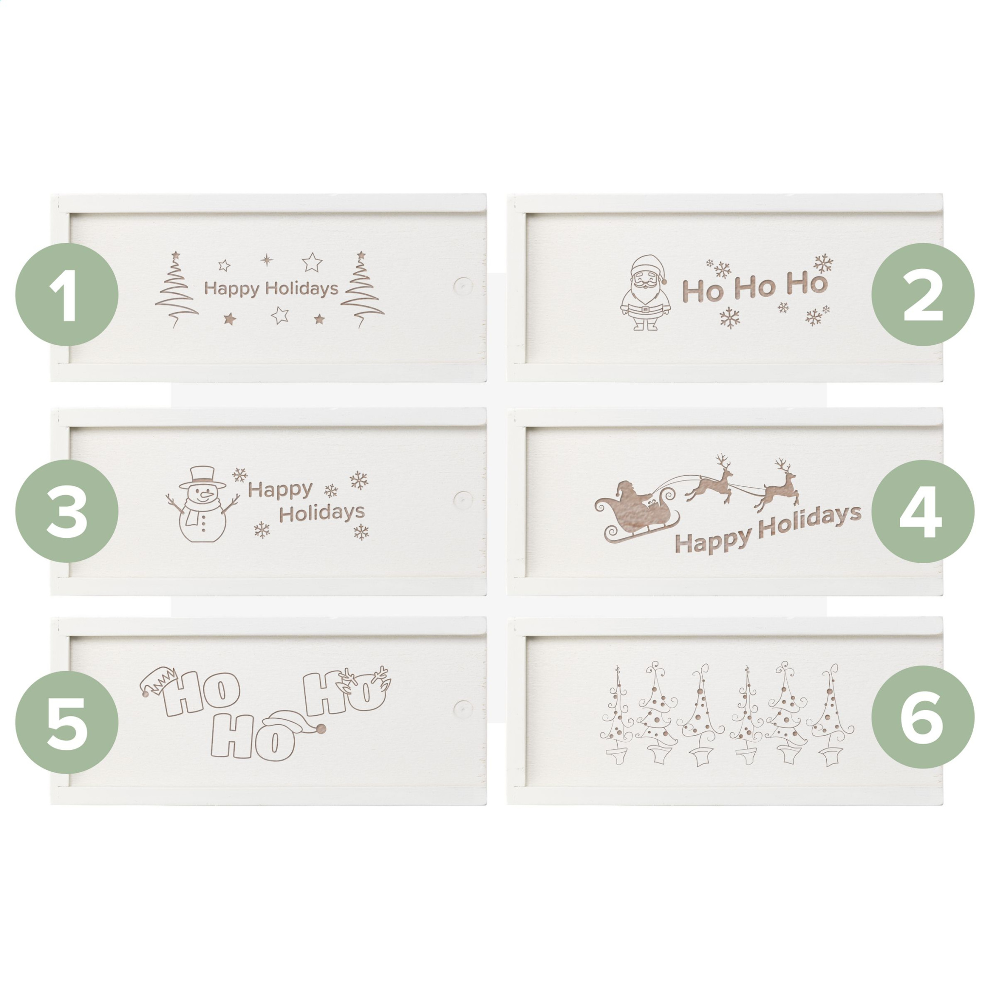 Trästapelspel (48 block) med standard juldesign. Tornmått 16,5 x 6 x 6 cm. Presenteras med en vit trälåda med skjutöppning för enkel förvaring. Inkl. instruktioner. - Den här produkten är tryckt med en vanlig juldesign. Val av 6 olika mönster som visas på bilderna. Det är inte möjligt att skräddarsy en design. Varje artikel levereras i en individuell brun kartong.