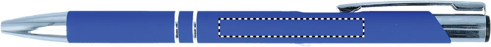 Kulspetspenna i gummerad finish med blank spets. Blått bläck. Vid gravyr blir loggan metall färgad dock något mattare än detaljerna på pennan.