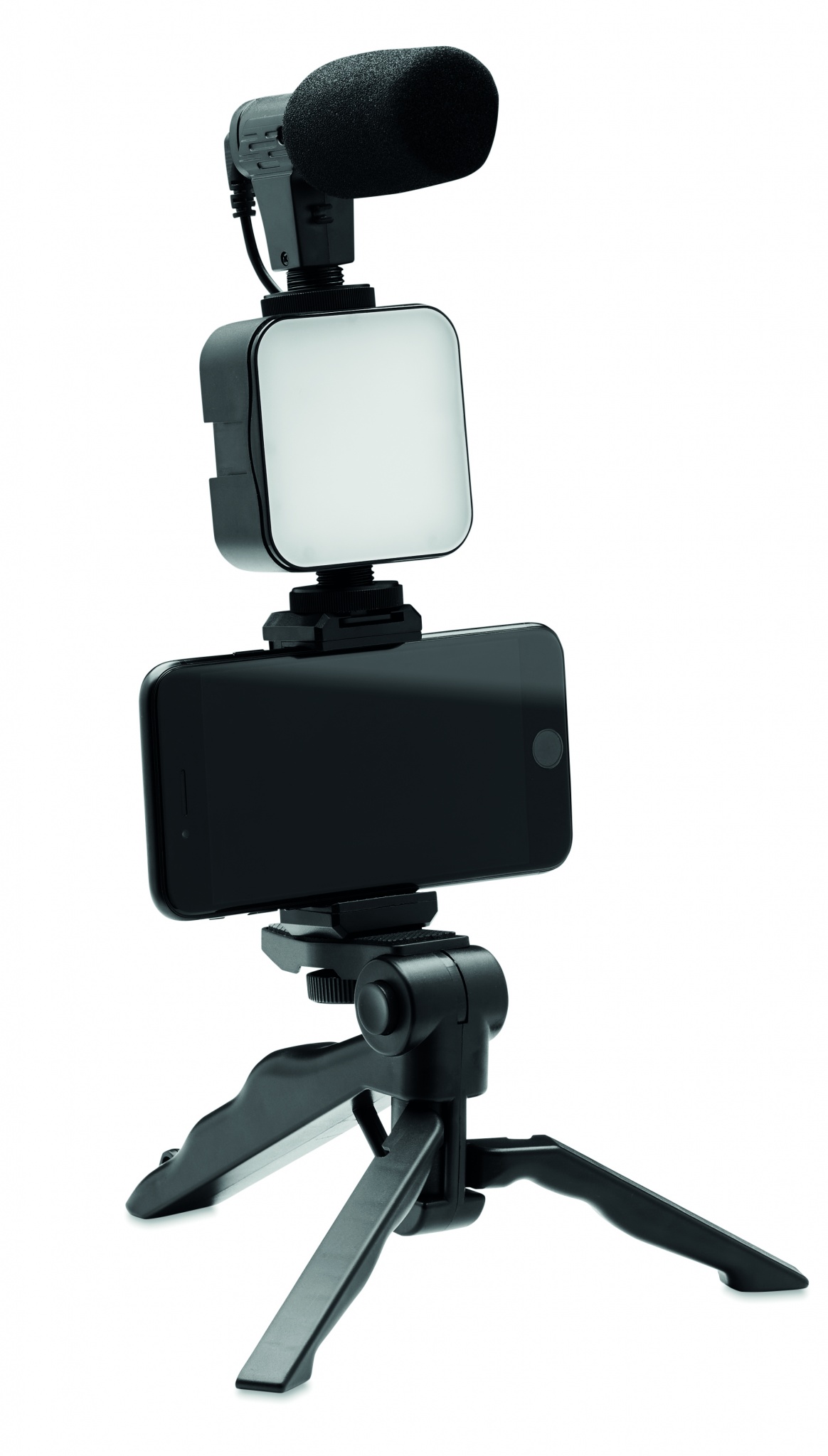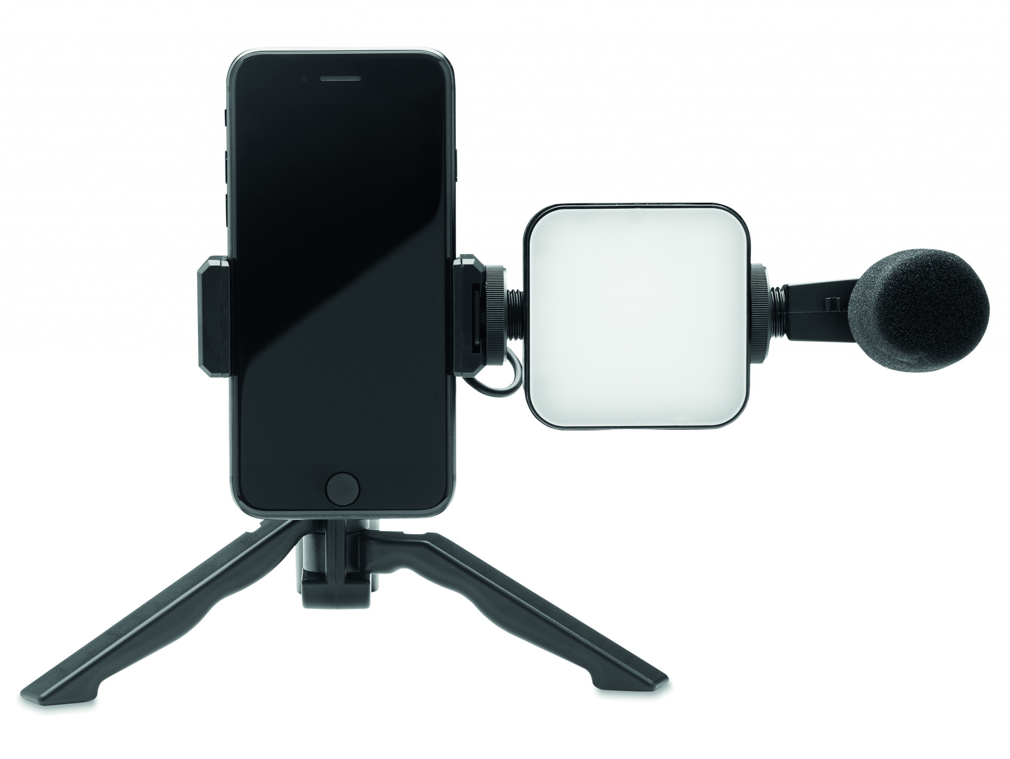 Videokit för smarttelefoner. Inkluderar justerbart stativ med telefonfäste och mikrofon. LED-ljus med 10 ljusinställningar. Exklusive 2 x typ-AA-batterier.